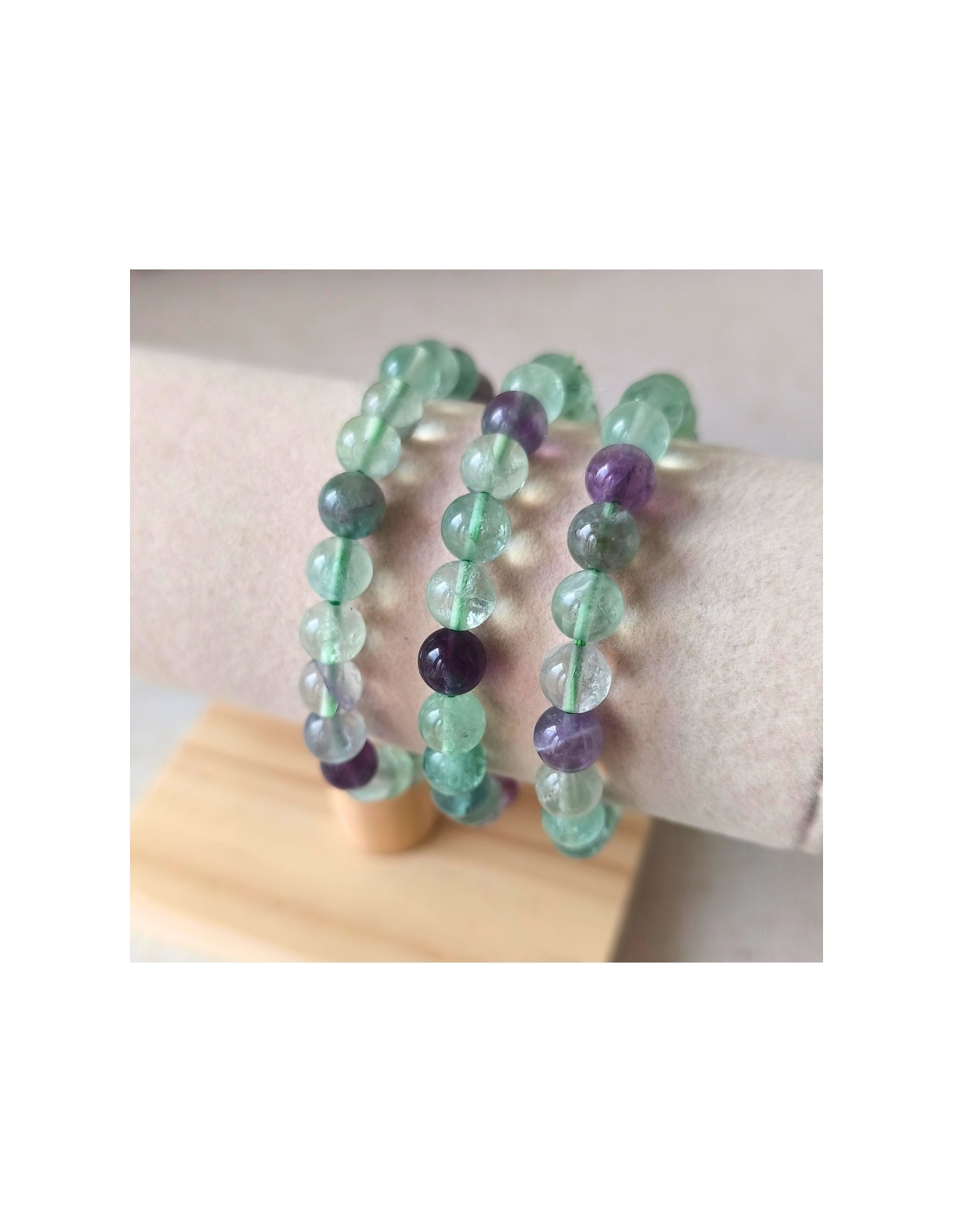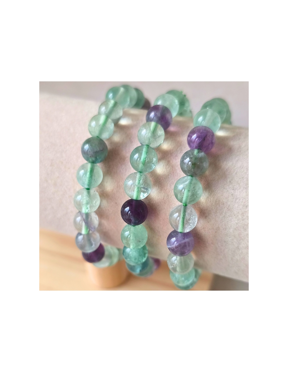 La Fluorine multicolore, aux nuances de vert, violet et parfois bleu, est une pierre fascinante qui allie beauté et énergie structurante. En bracelet boule de 8 mm, elle capte la lumière et diffuse une vibration de clarté, idéale pour organiser les pensées et renforcer la concentration.