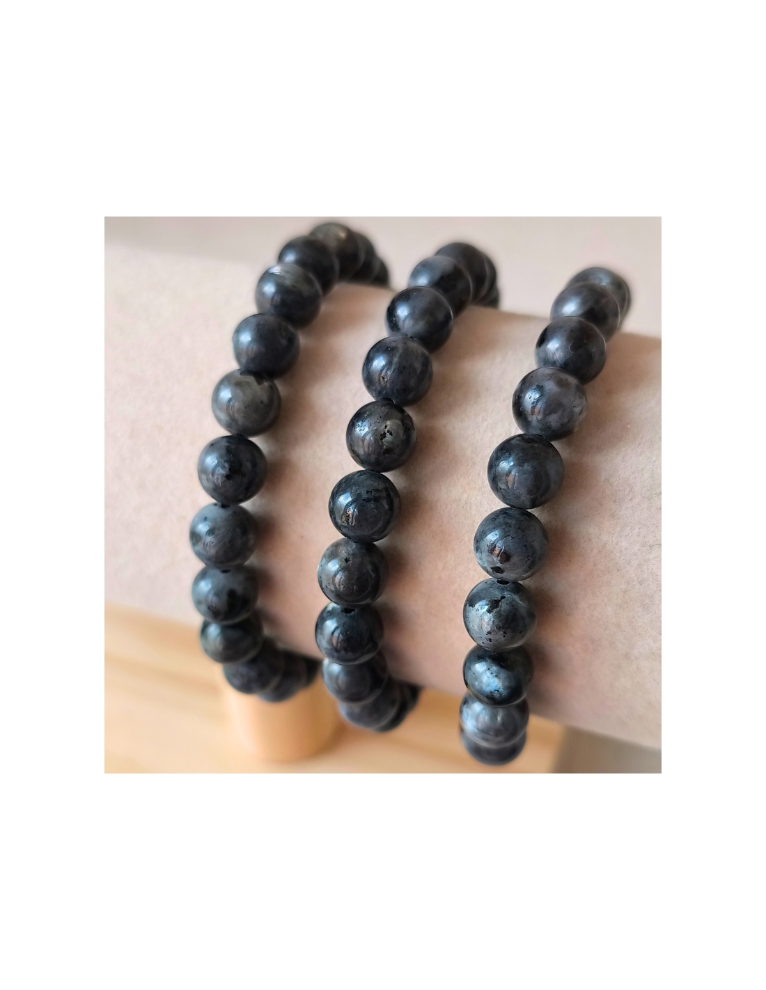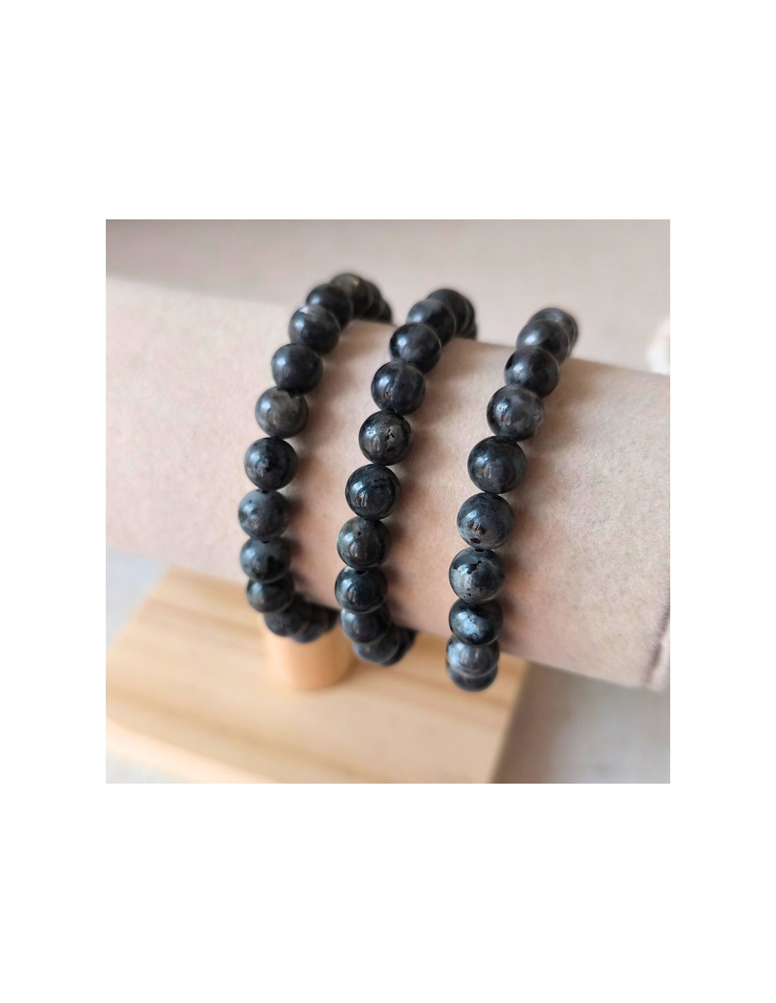 La Larvikite, parfois appelée “labradorite norvégienne”, dévoile des reflets argentés et bleutés qui captent la lumière comme un éclat discret venu du Nord. En bracelet boule de 8 mm, elle est à la fois sobre et élégante, tout en diffusant une énergie protectrice et clarifiante.