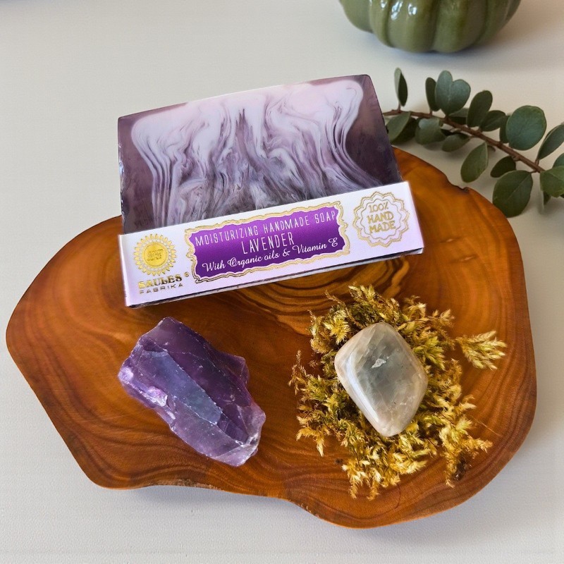 Le savon artisanal à la Lavande, floral et délicatement parfumé, invite à la détente du soir et crée une atmosphère propice au repos.