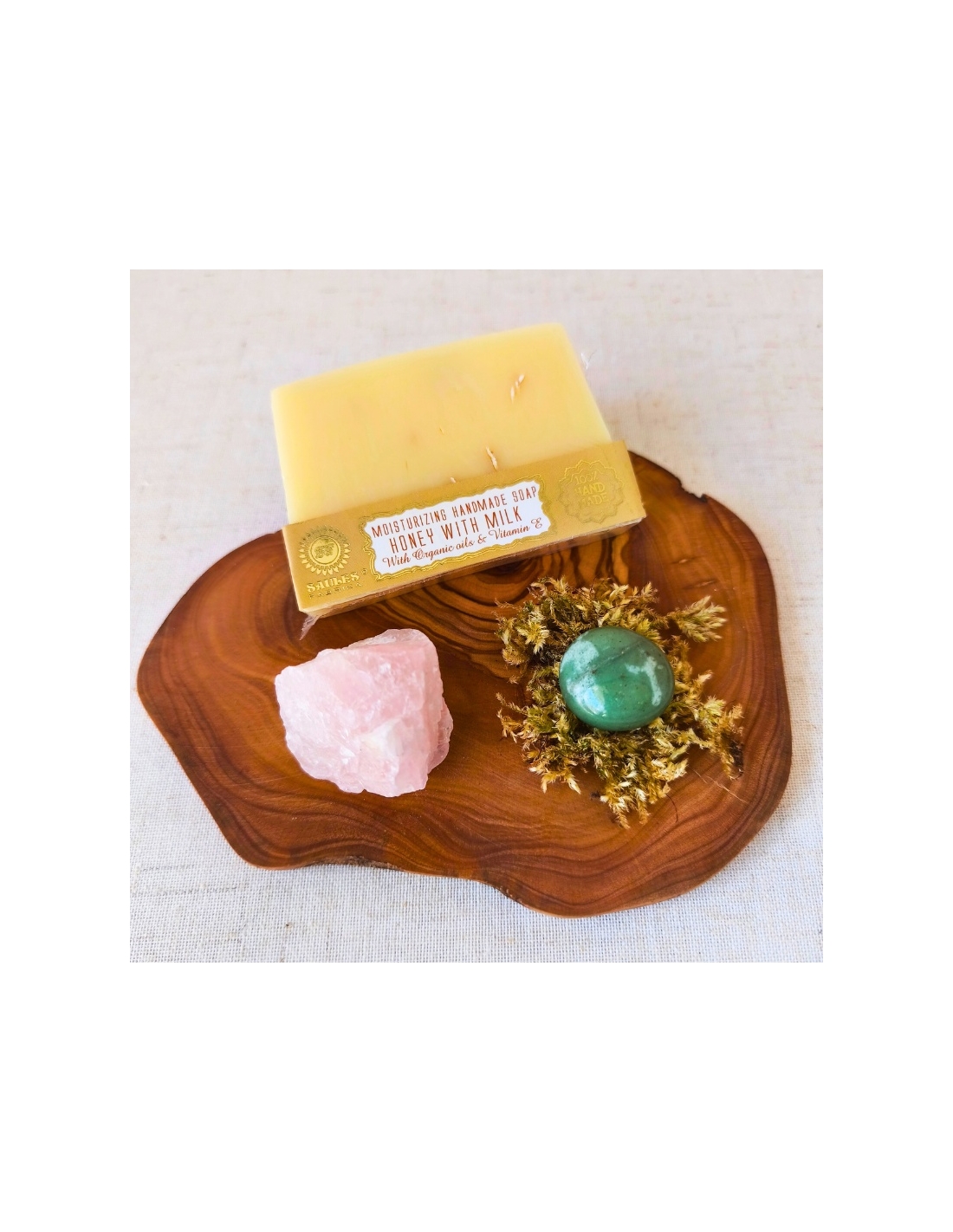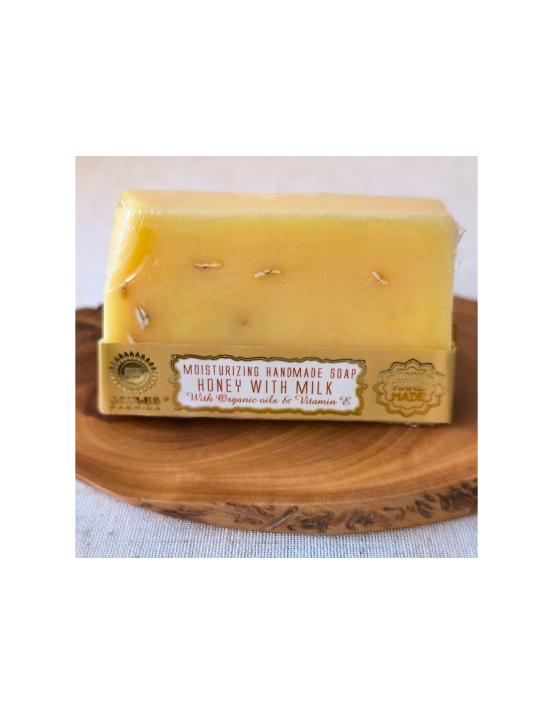 Savon artisanal Miel & lait (80 g, Saules Fabrika, Lettonie) – Naturel et doux, il diffuse un parfum chaleureux et réconfortant.