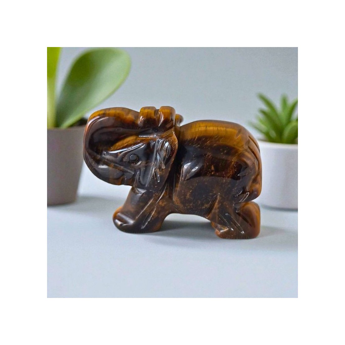 L’éléphant en œil de tigre, symbole de force intérieure, aide à affronter les défis avec assurance et lucidité.
