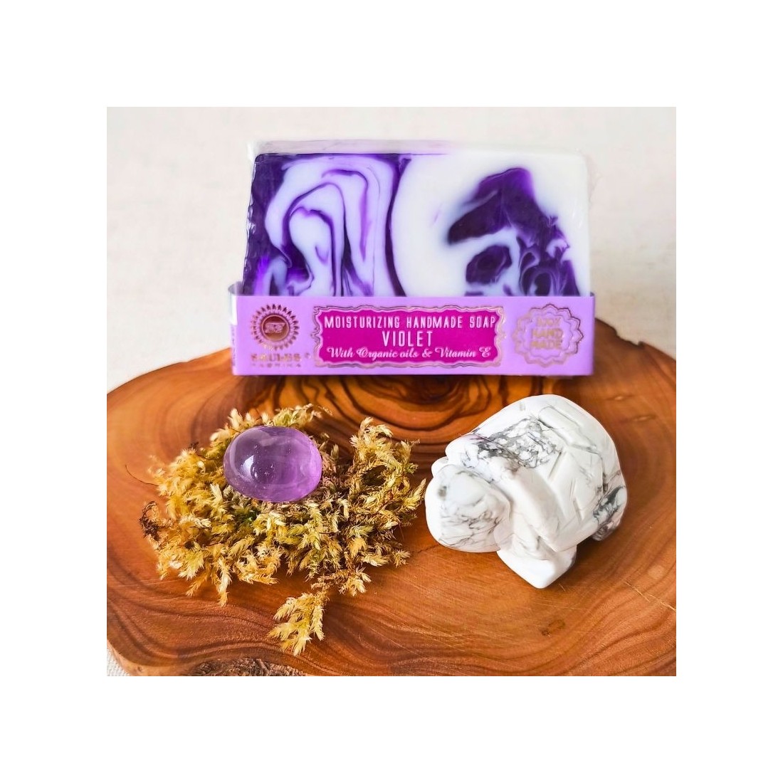 Coffret Tortue rêveuse – Howlite blanche, Améthyste et savon Violette