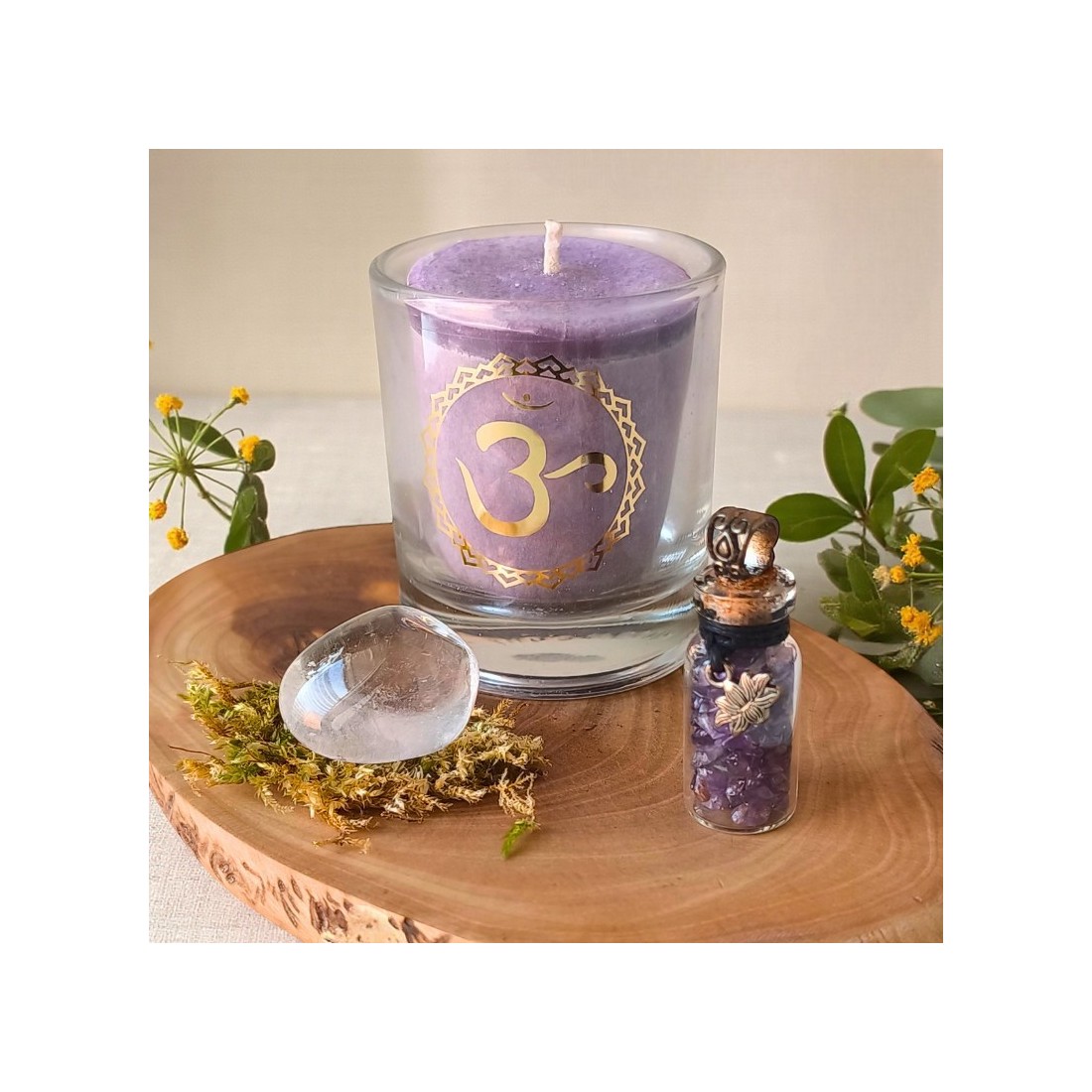 Cristaux de Sérénité – Améthyste, Cristal de roche et bougie Oud Patchouli
