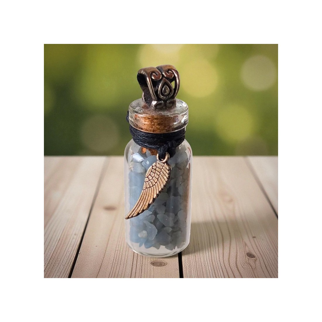 La fiole pendentif remplie d’éclats d’Angélite, pierre d’apaisement, invite au calme, à la confiance émotionnelle et à la douceur intérieure.