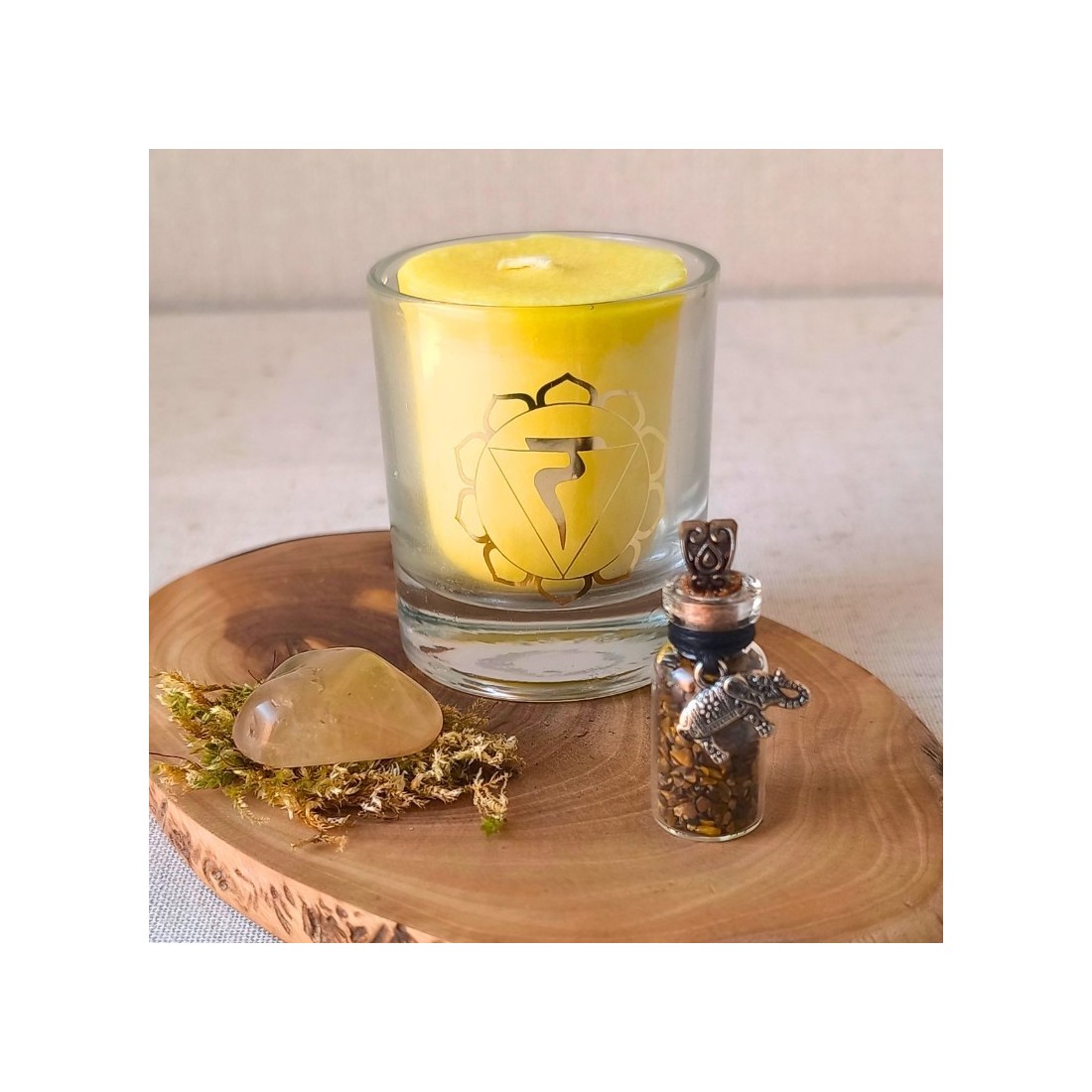 Il associe une fiole pendentif remplie d’éclats d’œil de tigre, une pierre roulée en citrine naturelle et une bougie artisanale parfumée à la bergamote, au citron vert et au pamplemousse.