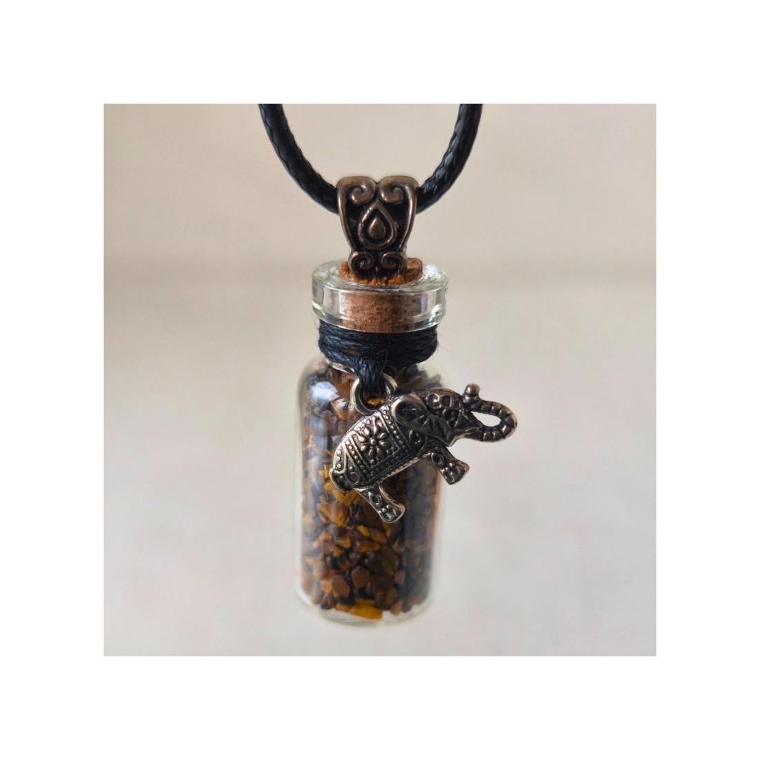 Remplie d’éclats d’œil de tigre (qualité A, Afrique du Sud) et décorée d’un petit éléphant, symbole de force tranquille et de persévérance.