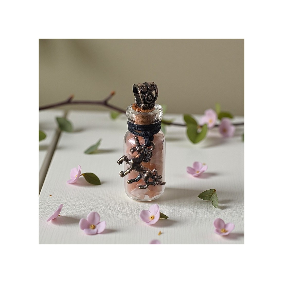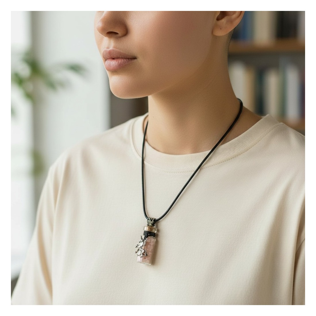 La fiole pendentif remplie d’éclats de Pierre de Lune, délicate et inspirante, accompagne la sensibilité et stimule l’intuition créative.