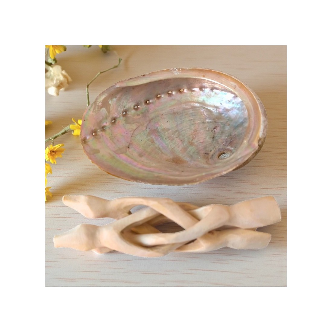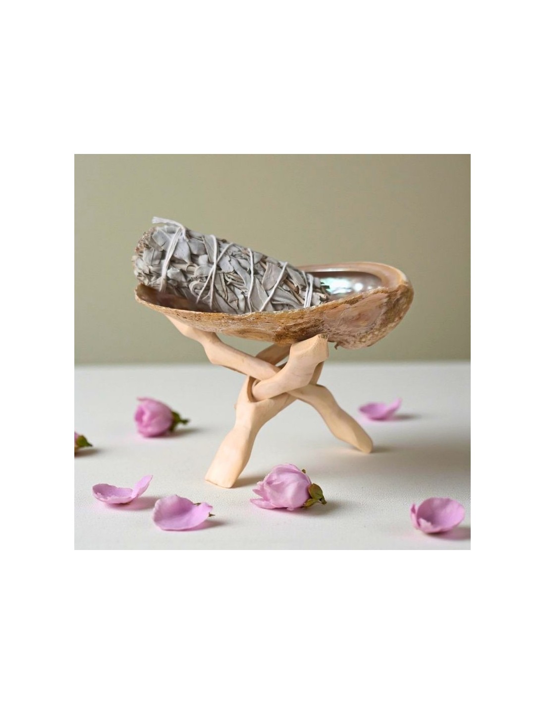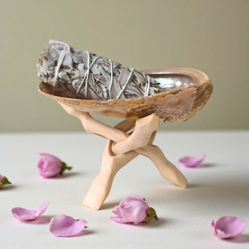 Coquille d’ormeau Haliotis posée sur un trépied en bois naturel, idéale pour déposer pierres ou bijoux lors d’un rituel de purification doux. Un support pratique et décoratif, apprécié pour sa lumière irisée et son aspect naturel, à offrir ou à s’offrir.