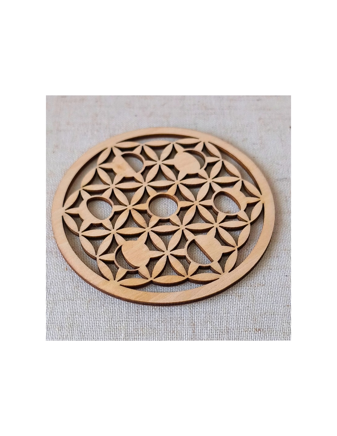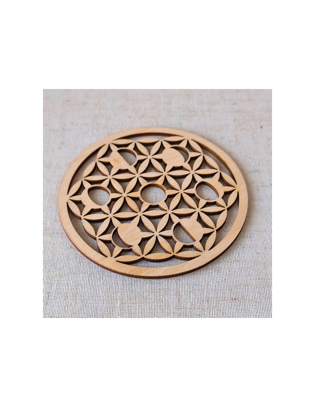 Cette plaque de 10 cm, découpée et gravée artisanalement dans du bois de tilleul issu de forêts françaises durables, unit deux symboles universels : la Fleur de Vie, représentation ancestrale de l’harmonie cosmique, et les phases lunaires, cycles éternels de transformation et de renouveau. Elle devient un support énergétique naturel pour purifier et recharger vos pierres, amplifier vos intentions et harmoniser vos rituels. Son énergie douce et boisée accompagne vos cristaux dans le respect de la Terre et de ses rythmes.