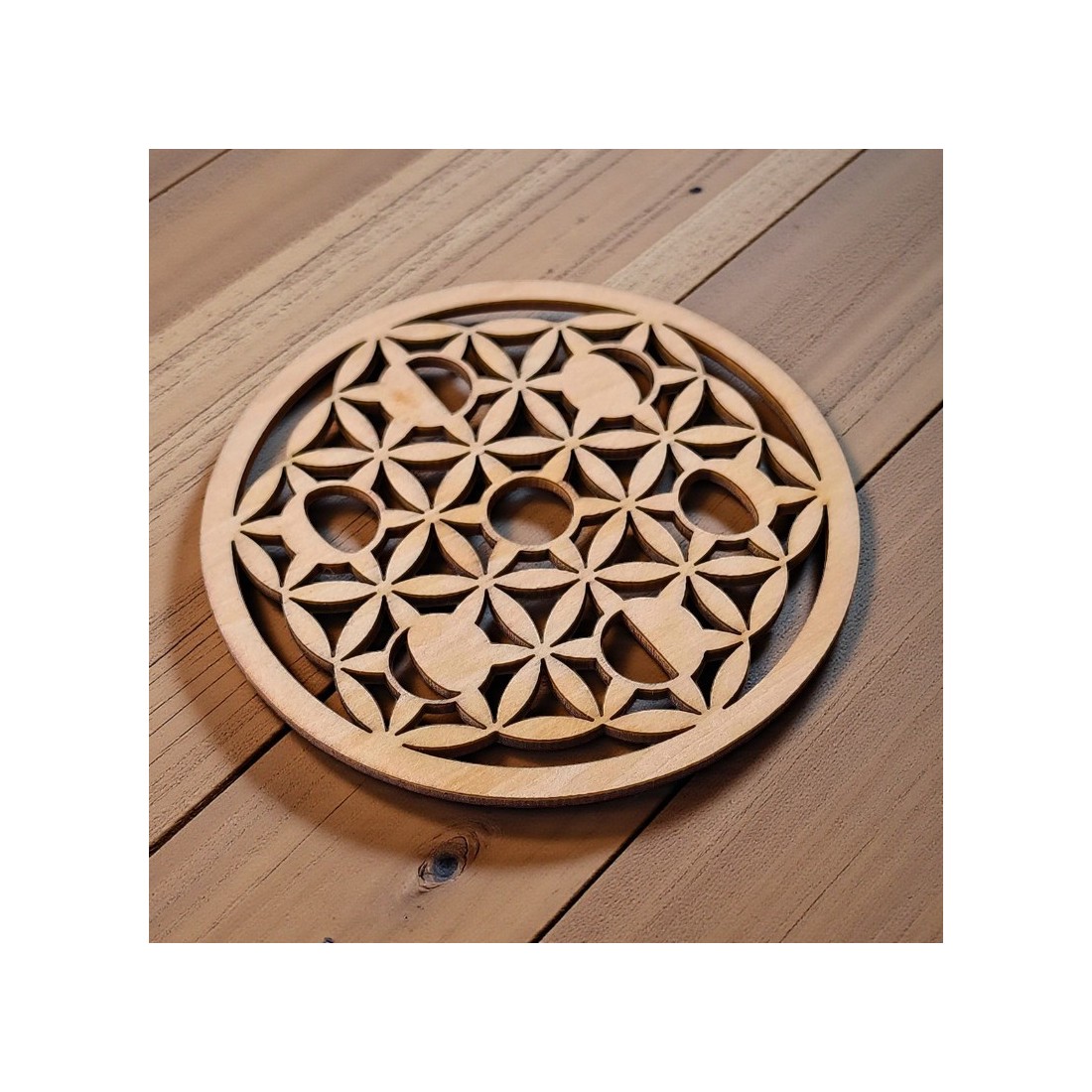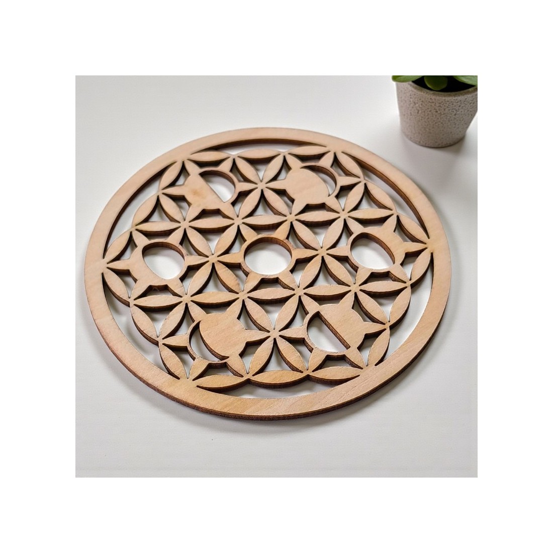Plaque de rechargement en bois gravé - Fleur de Vie et Cycles lunaires
