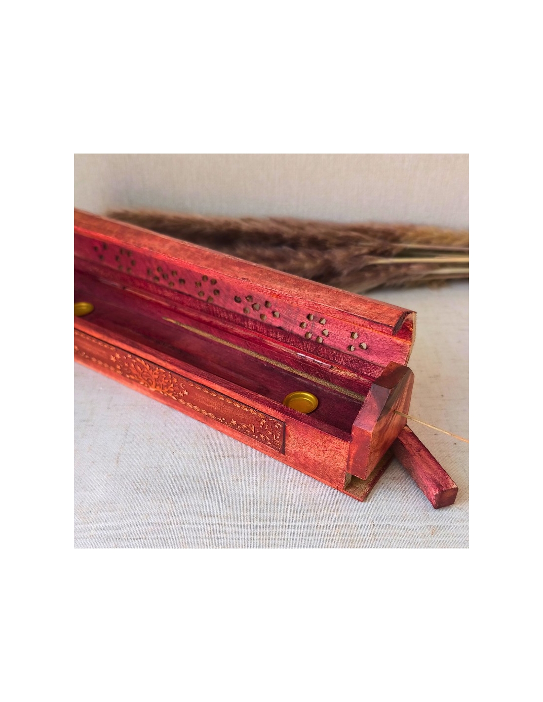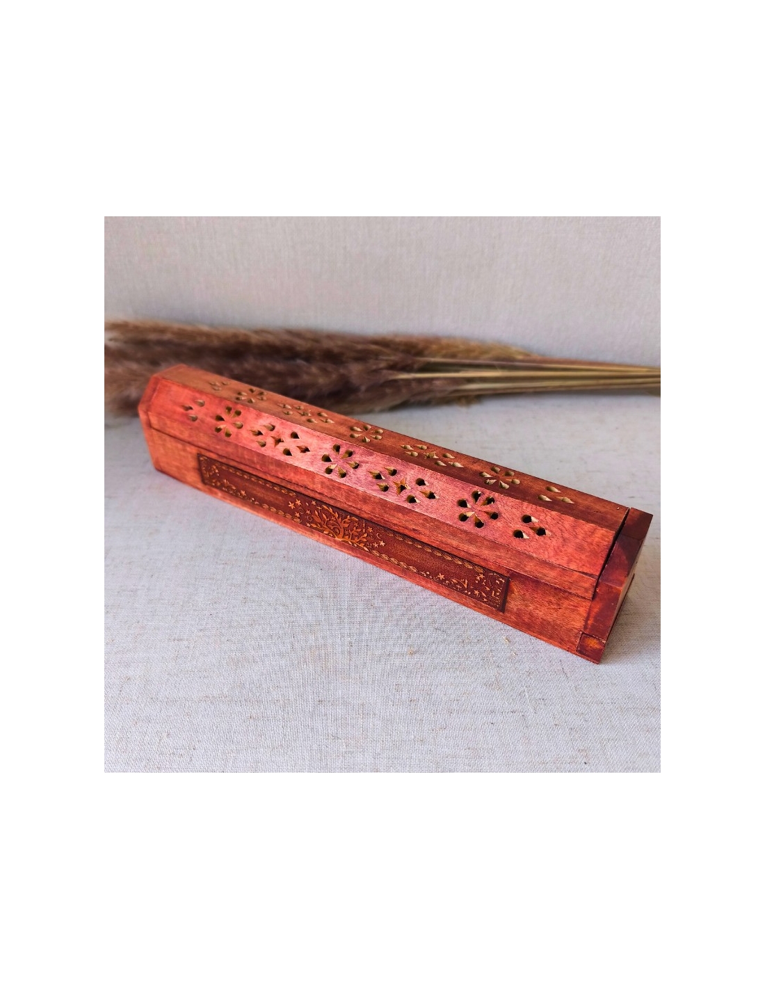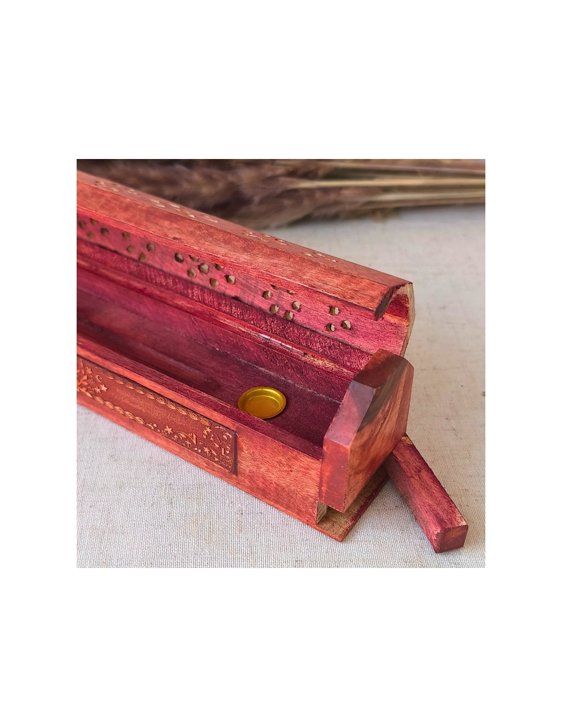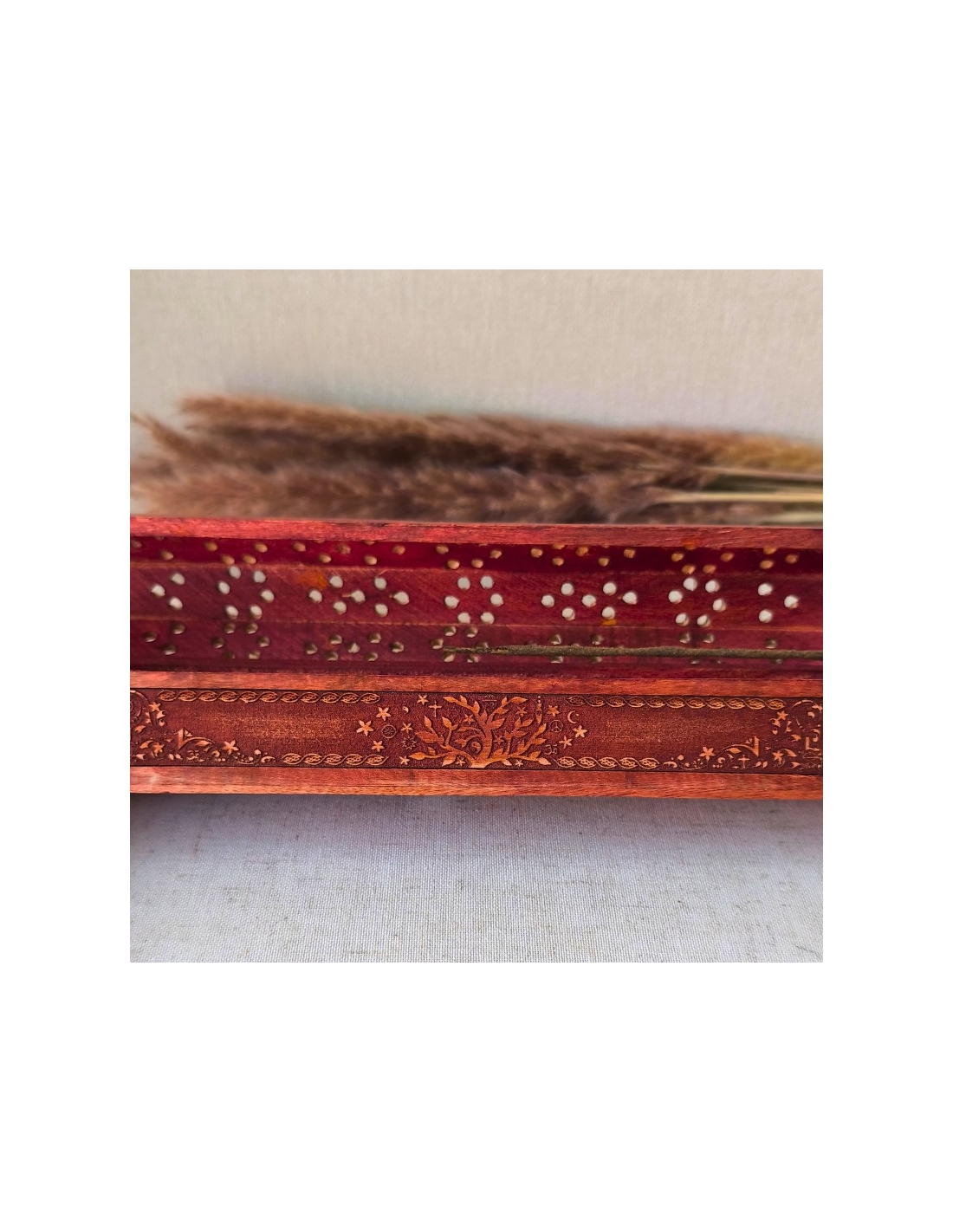 Cette boîte brûle-encens artisanale en bois d’acacia est gravée du symbole sacré de l’Arbre de Vie. Avec son réceptacle adapté aux bâtonnets et aux cônes, elle recueille les cendres et diffuse la fumée avec élégance. Pratique, elle possède un compartiment de rangement intégré pour vos bâtons d’encens.