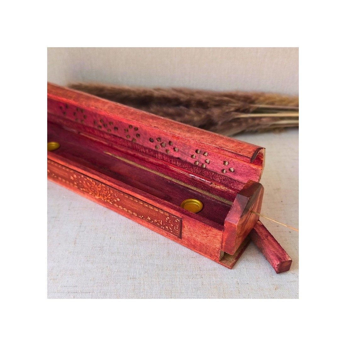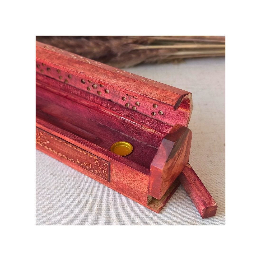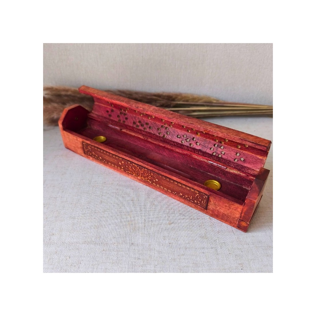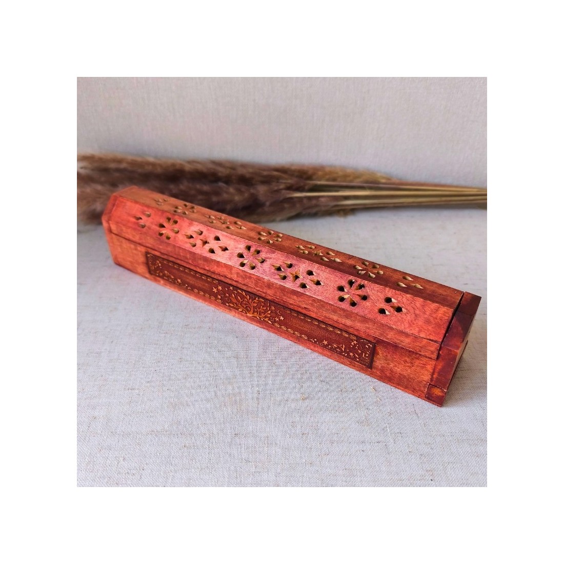 Cette boîte brûle-encens en bois d’acacia est un bel objet artisanal façonné en Inde et gravé du symbole intemporel de l’Arbre de Vie.