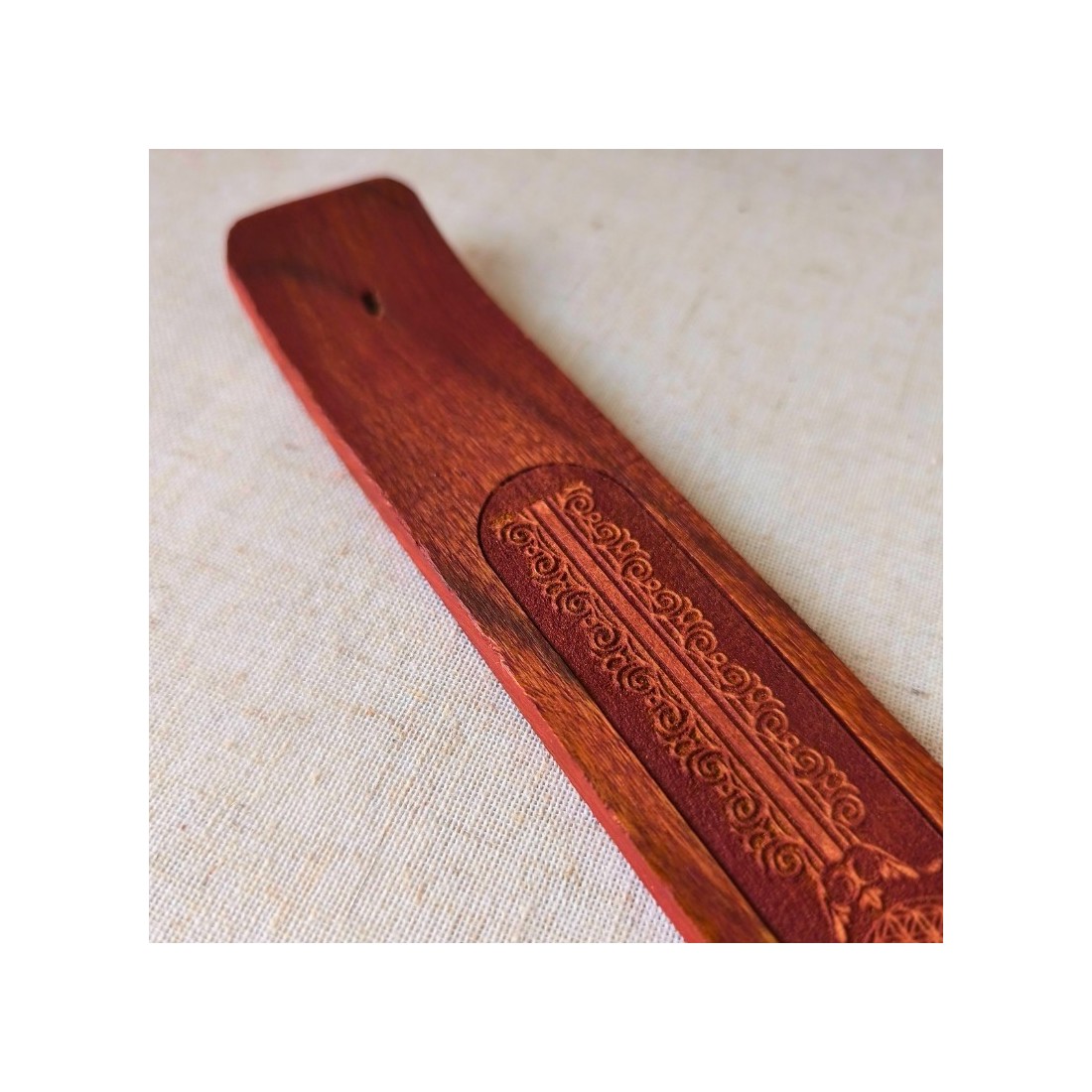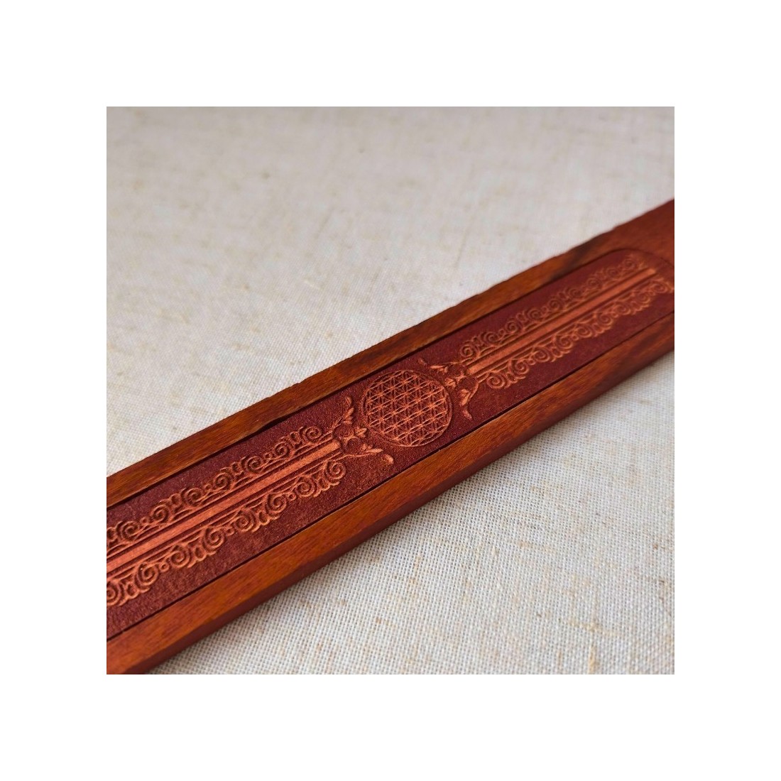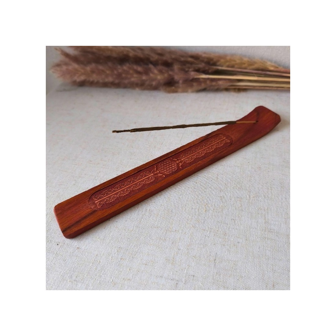 Porte-encens artisanal en acacia gravé Fleur de Vie, fabriqué en Inde.
