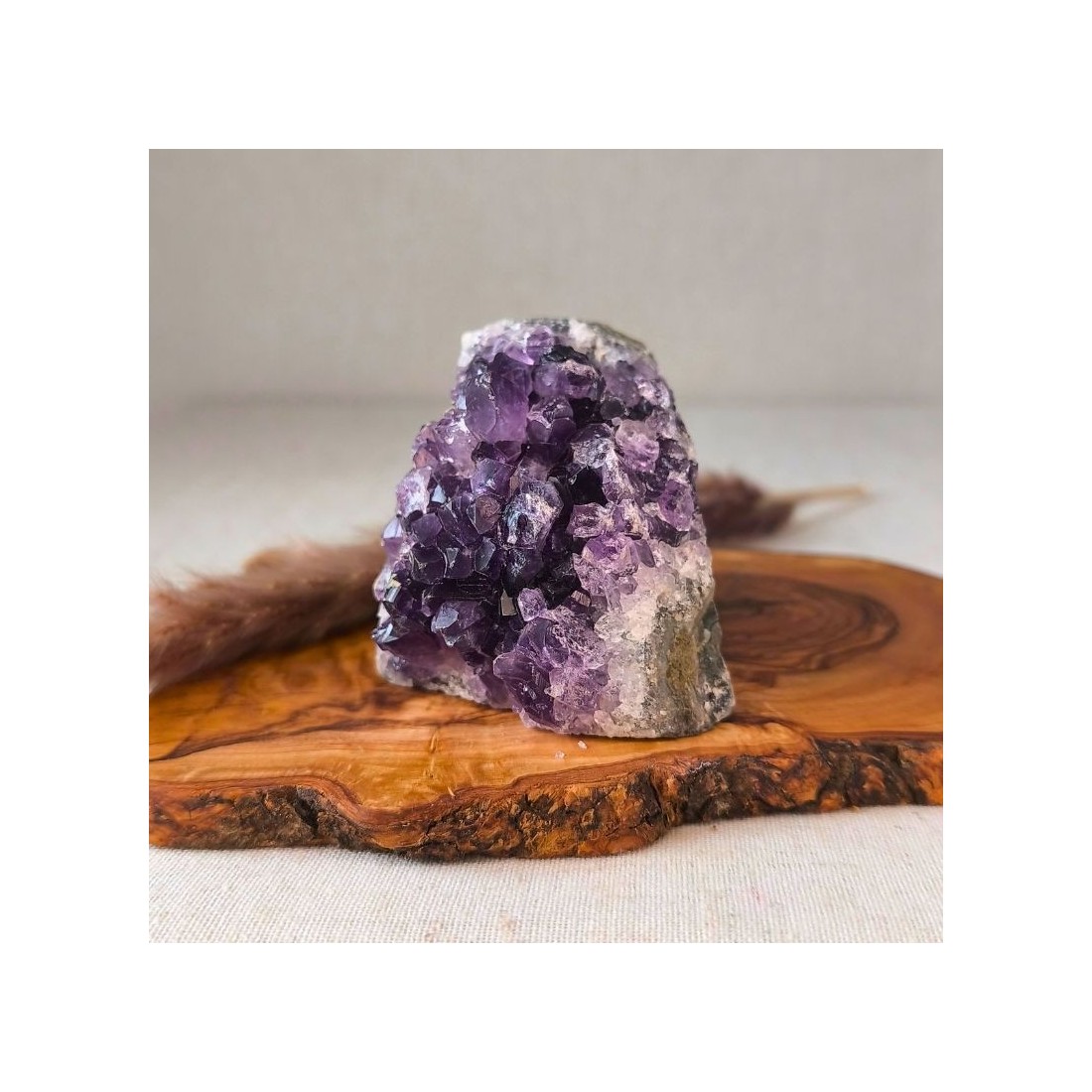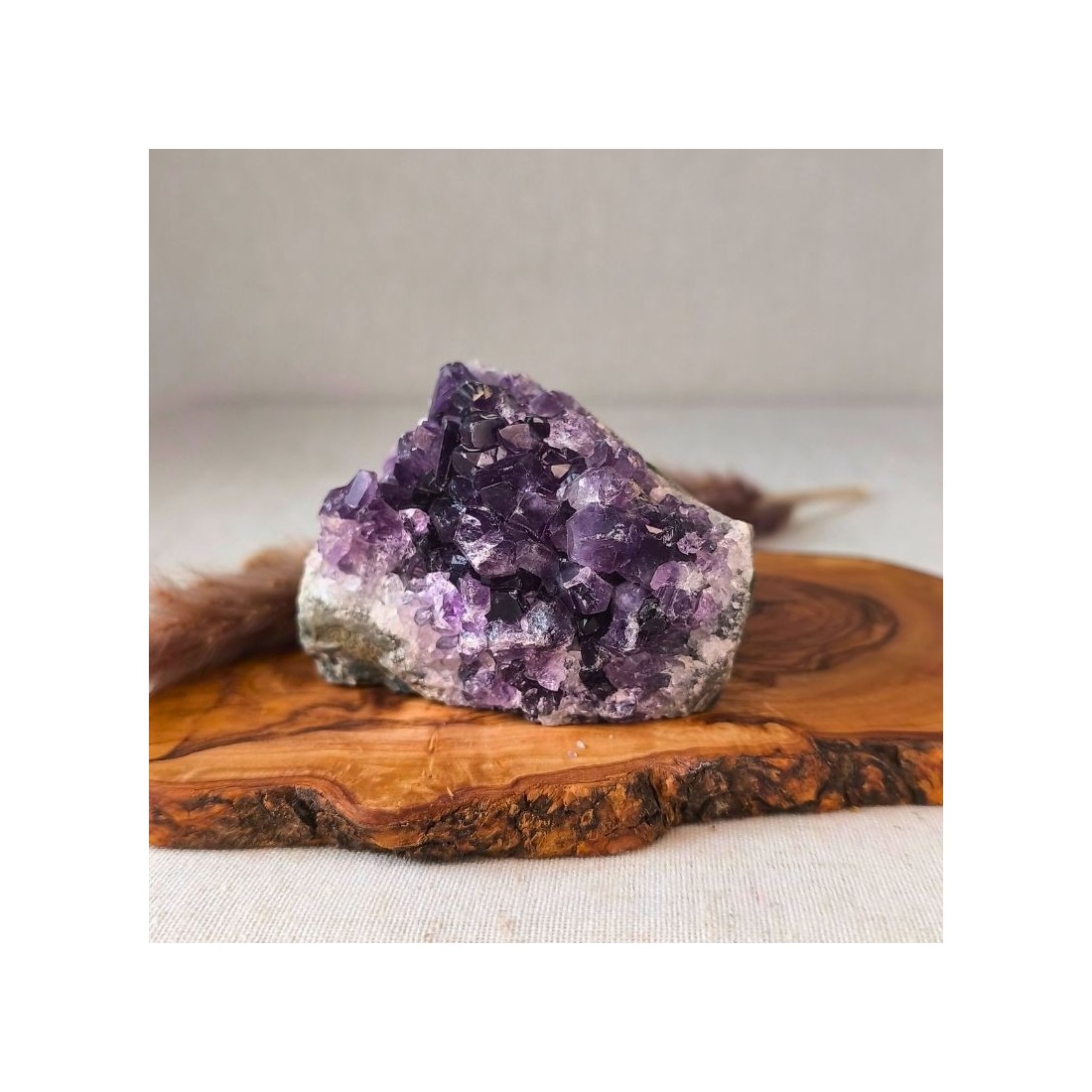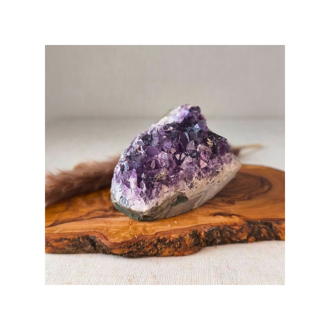 Cette géode d’améthyste à bord brut de 222 g, originaire d’Uruguay, se distingue par la richesse de ses nuances violettes et la densité de sa cristallisation.