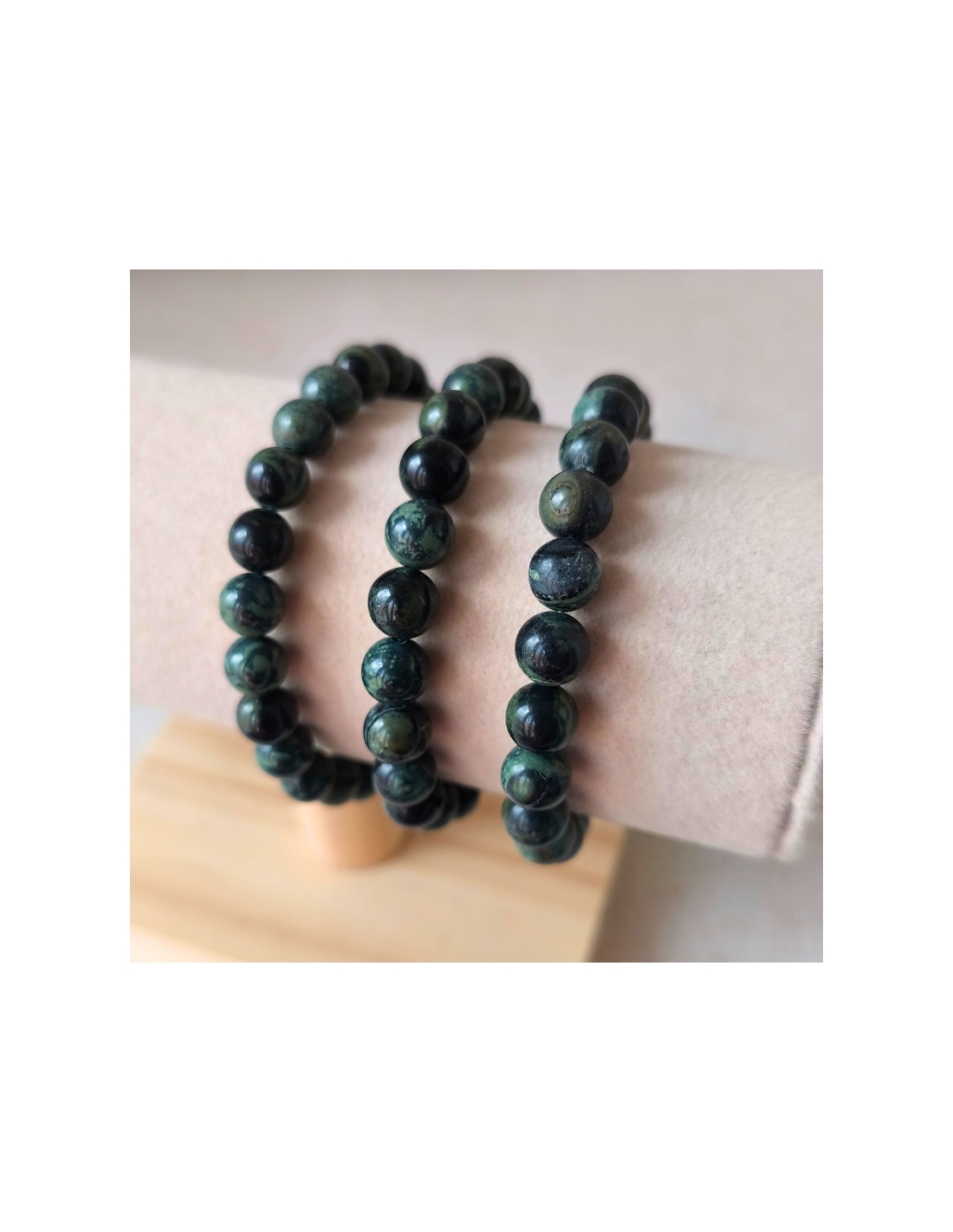 Le Jaspe Kambaba, aux volutes vert sombre parsemées de noir, est une pierre d’ancrage et de stabilité profonde. En bracelet boule de 8 mm, il diffuse une énergie tranquille, protectrice et apaisante, idéale pour retrouver l’équilibre face aux turbulences de la vie.