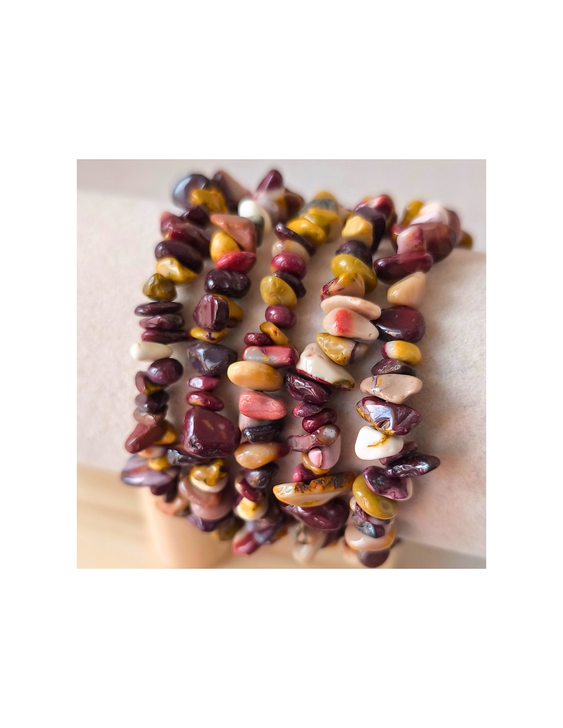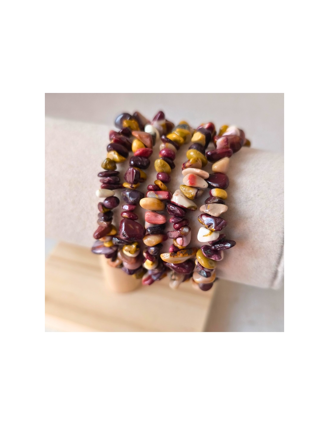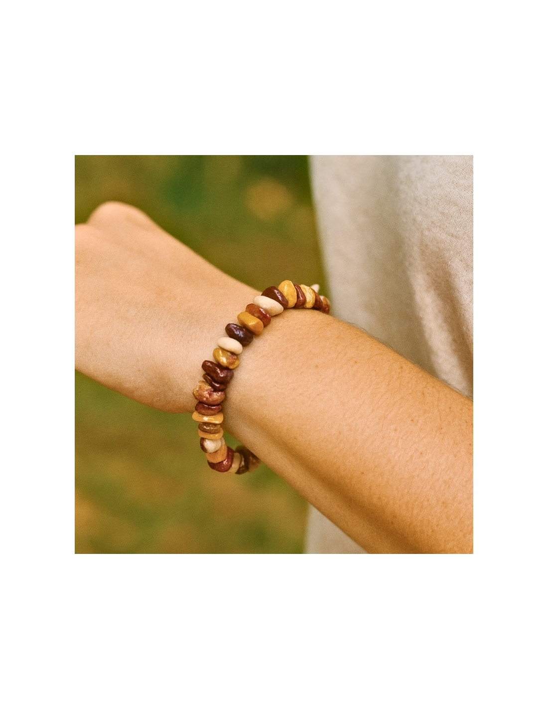 Le Jaspe mokaïte, pierre aux nuances chaudes de rouge, jaune et brun, incarne l’énergie vivante de la Terre australienne. Ce bracelet baroque, composé de fragments polis aux formes naturelles, vibre de vitalité et de dynamisme.
