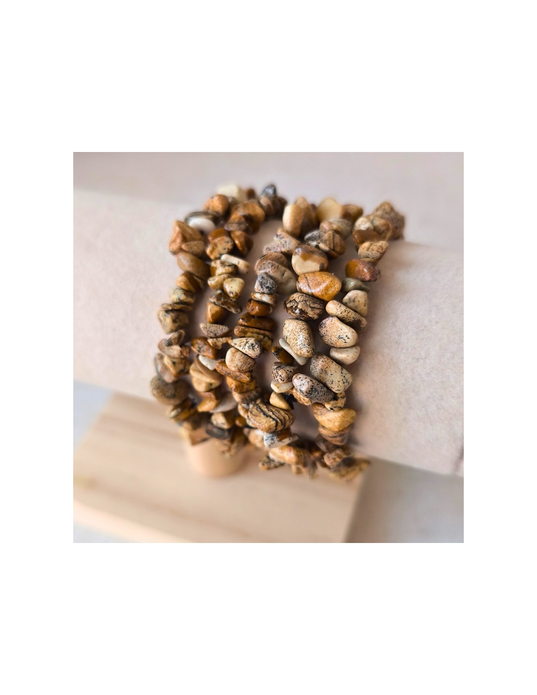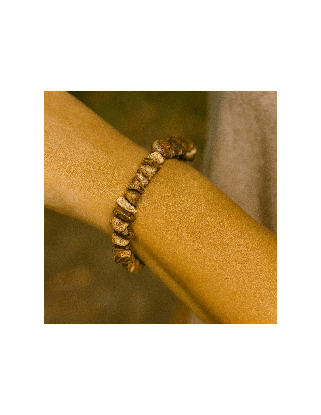 Le Jaspe paysage, avec ses tons ocres et bruns rappelant les reliefs terrestres, est une pierre d’ancrage et de sagesse. Ce bracelet baroque, composé de fragments polis aux formes naturelles, reflète la beauté brute des paysages minéraux qu’il incarne.