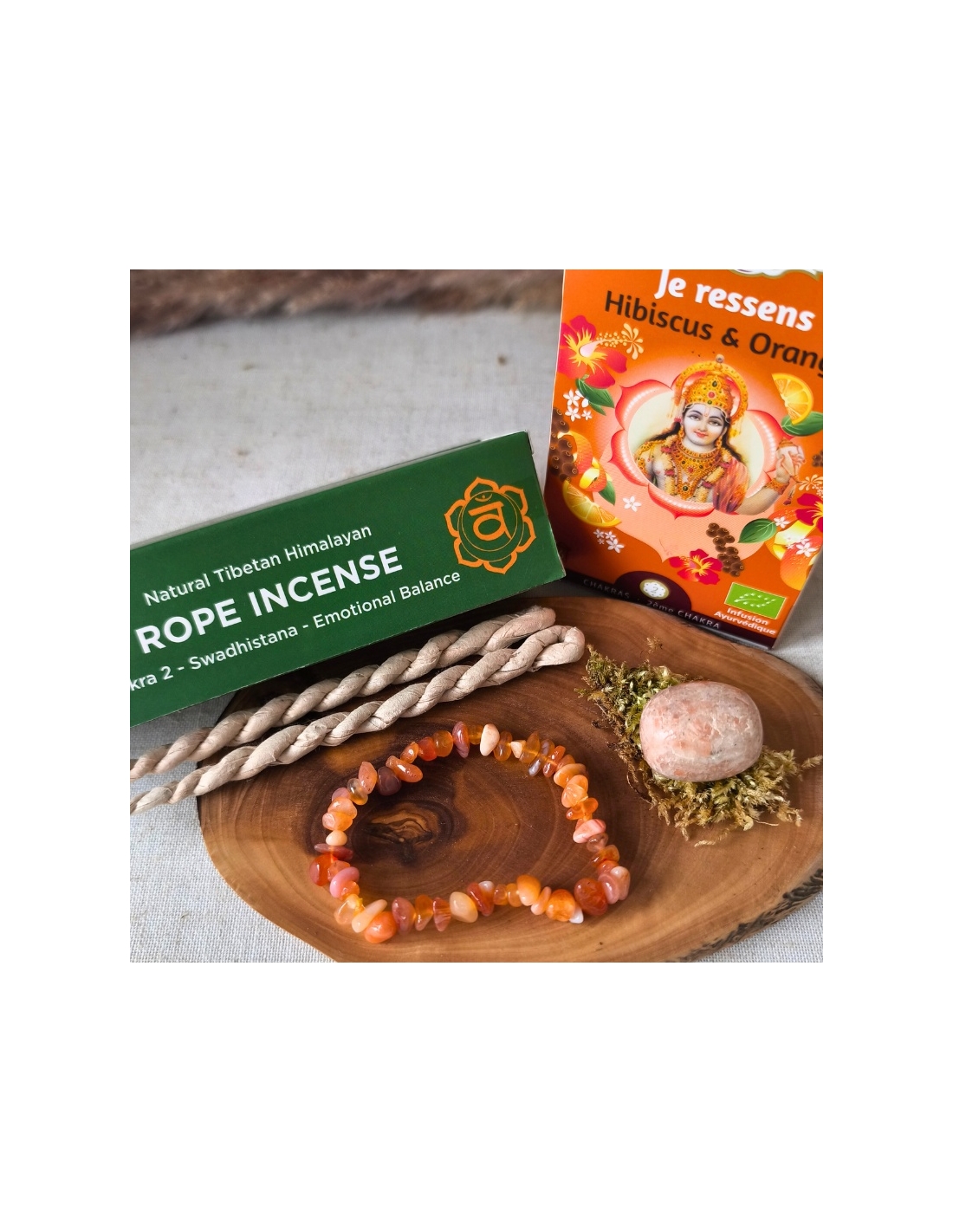 Cornaline et Pierre de soleil – Encens Genévrier et Cannelle – Infusion Hibiscus Orange