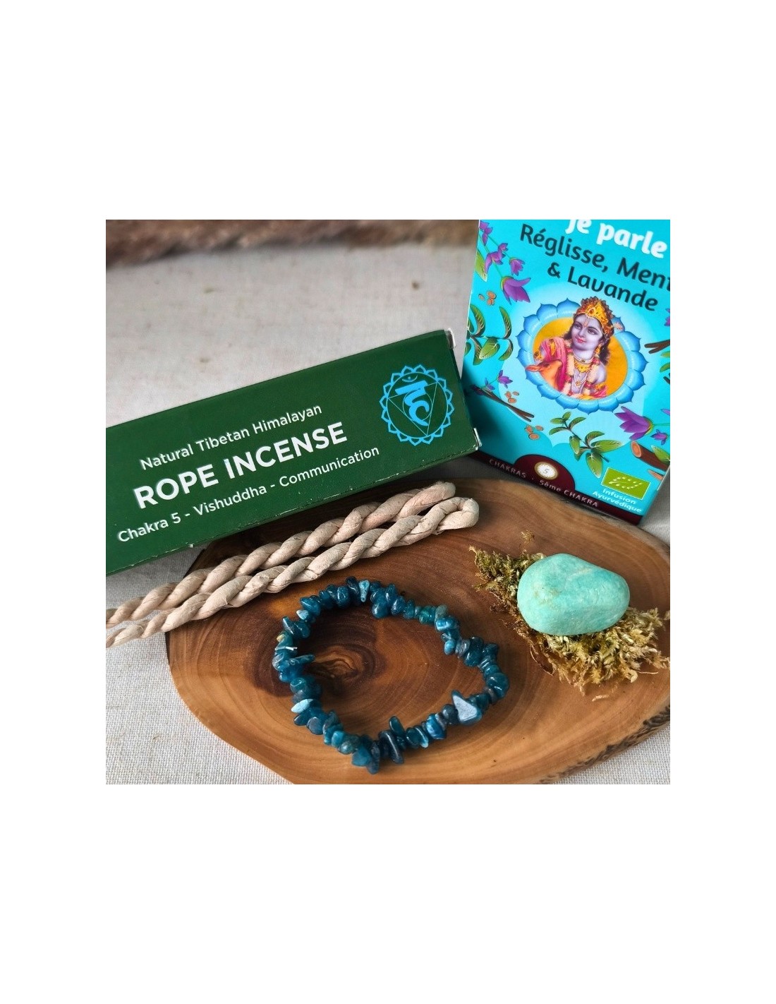 Un coffret frais et équilibré pour retrouver fluidité et confiance, avec apatite bleue, amazonite, tisane menthe-lavande et encens épicé.