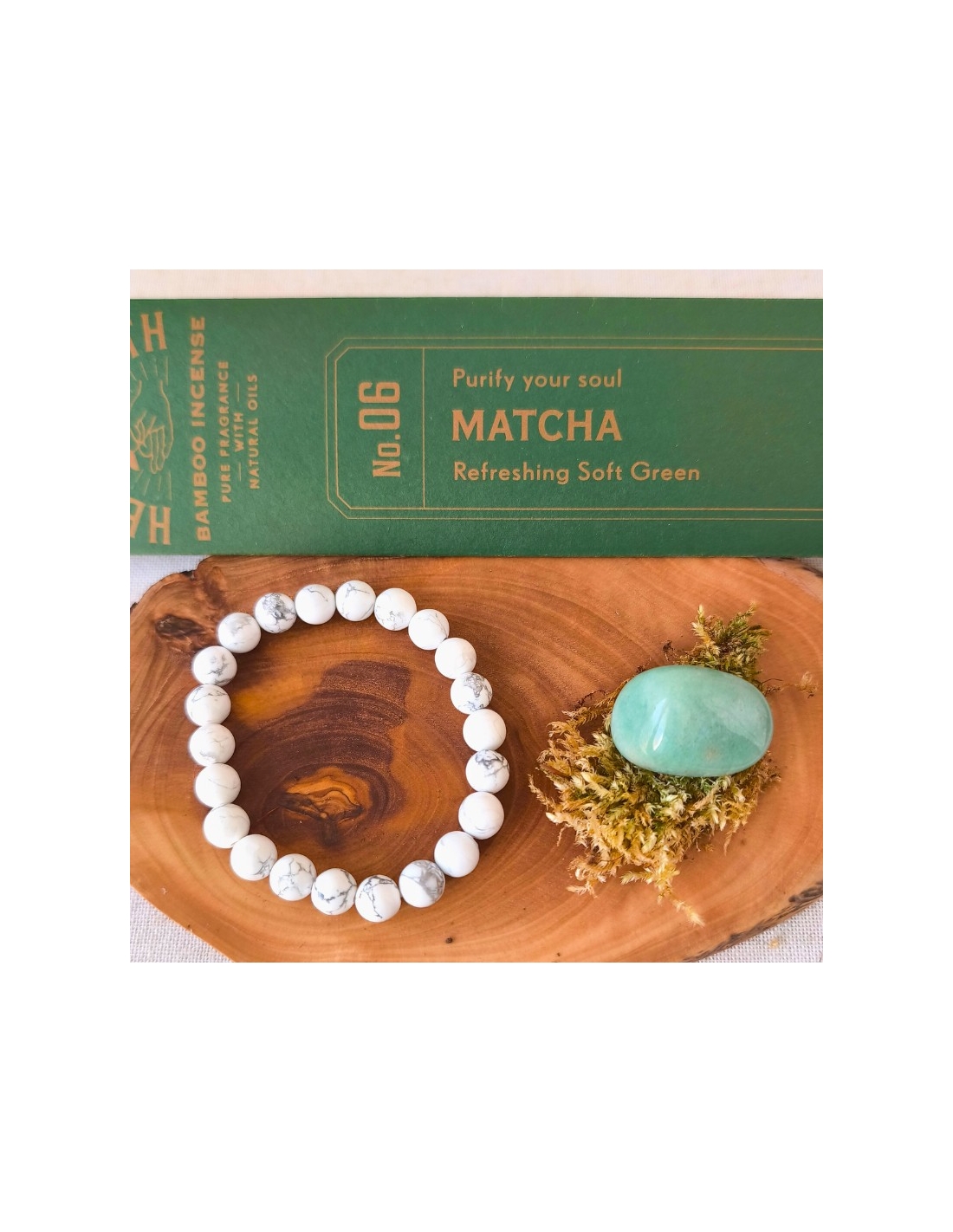 Howlite blanche et Aventurine verte – Encens Matcha