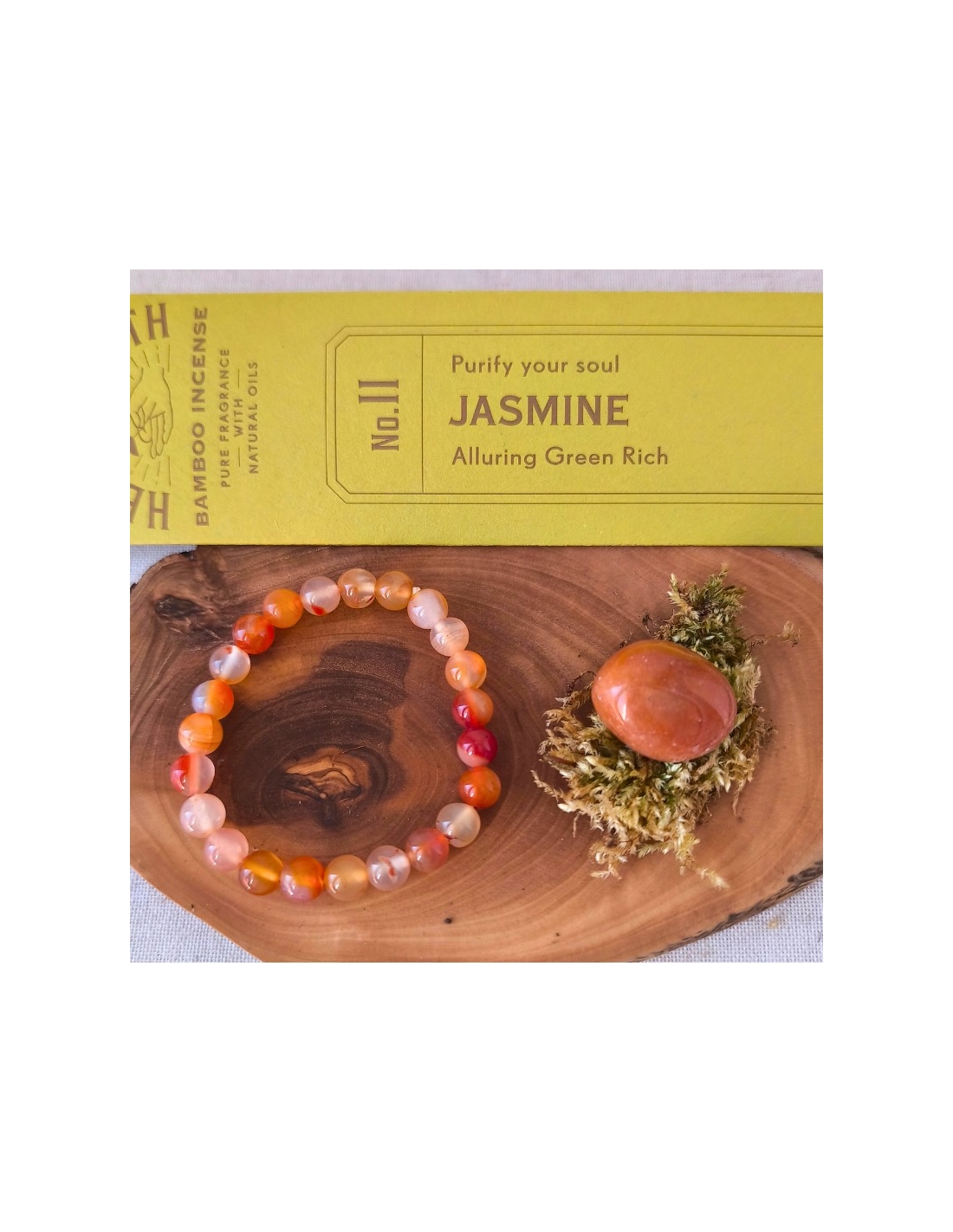 Il associe la vitalité rayonnante de la Cornaline, l’énergie chaleureuse de l’Aventurine orange et la senteur délicate et inspirante du Jasmin.