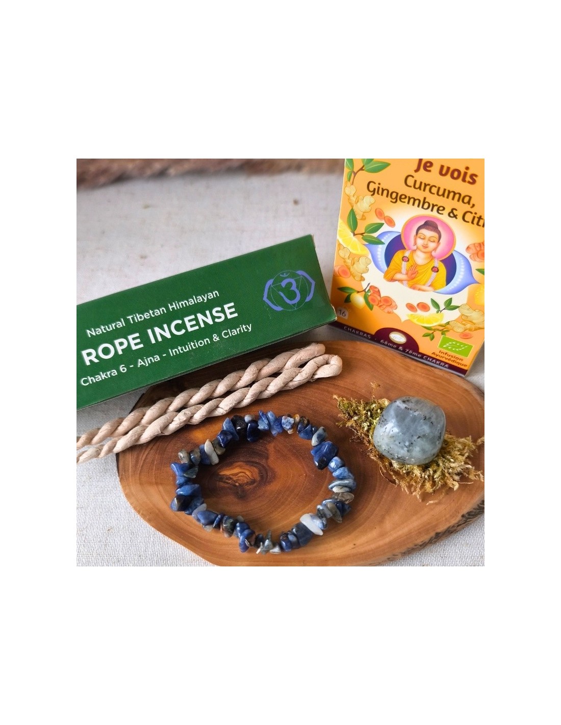 Entre la profondeur bleutée des pierres, la chaleur dorée de la tisane au curcuma et la douceur boisée de l’encens, ce coffret favorise un retour à soi clair et apaisé.