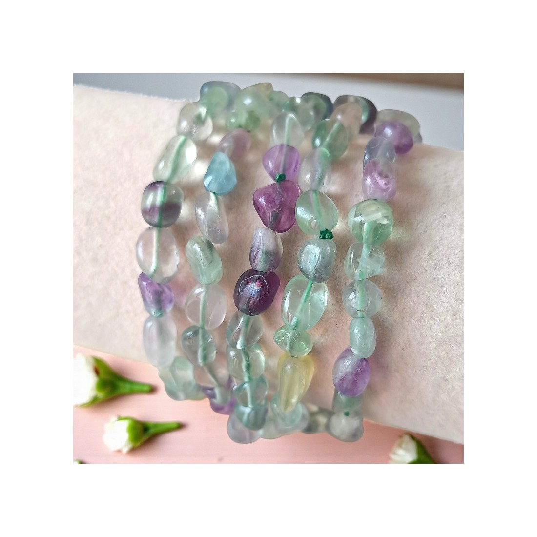 Chaque bracelet est unique : les teintes varient du vert tendre au violet profond.