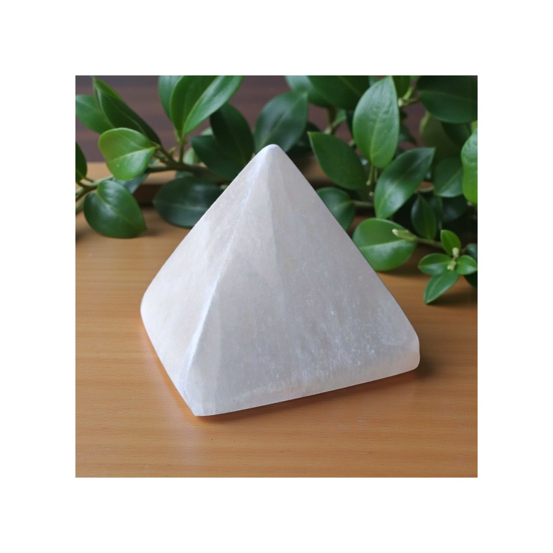 Taillée et polie artisanalement au Maroc, cette pyramide en sélénite séduit par son éclat satiné et sa transparence laiteuse.