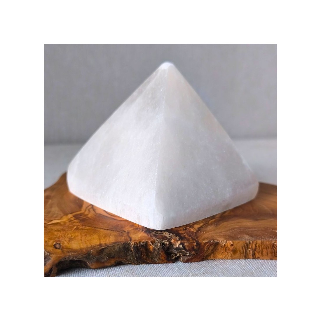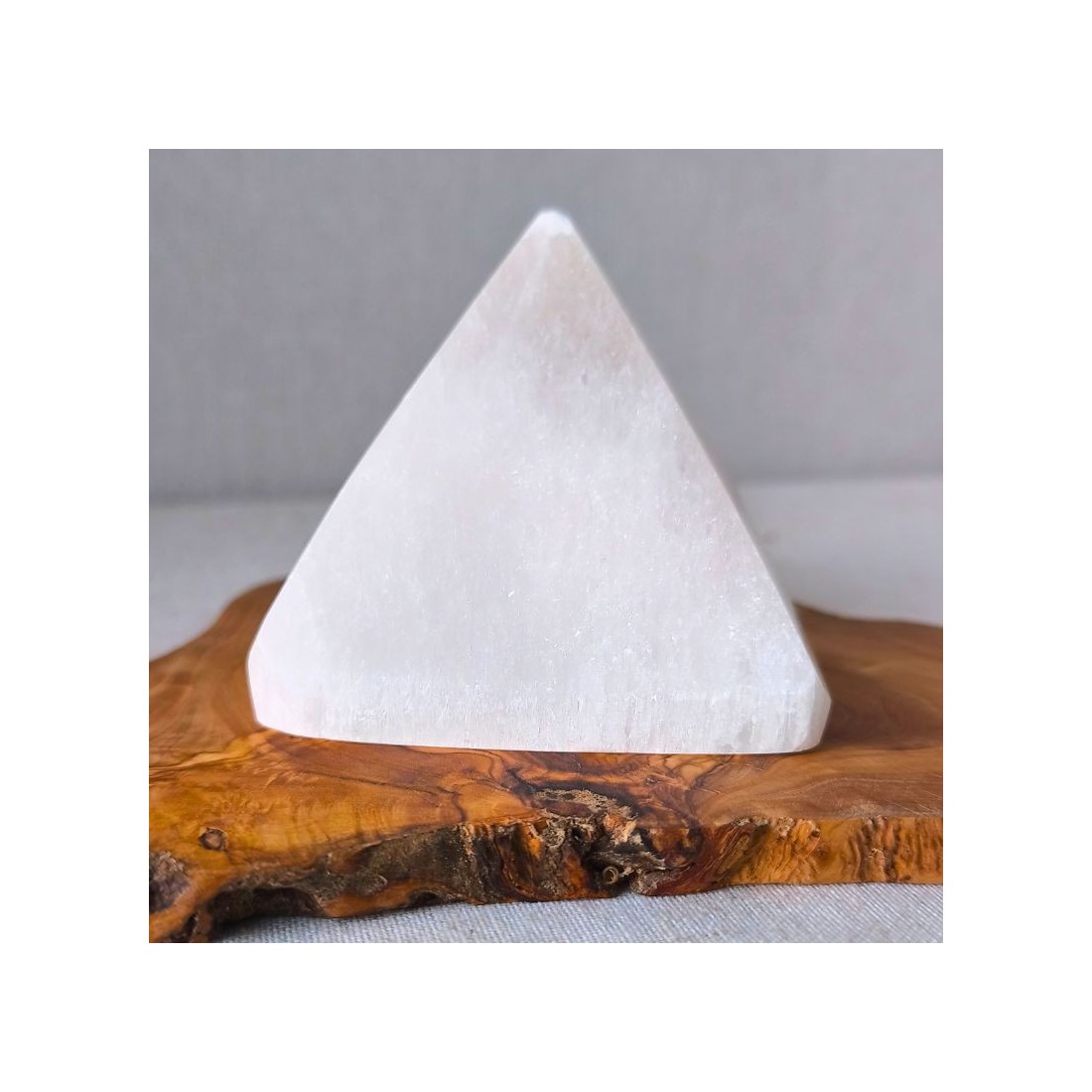 Taillée dans une sélénite de qualité A, la pyramide présente des stries naturelles qui lui donnent un aspect pur et apaisant.