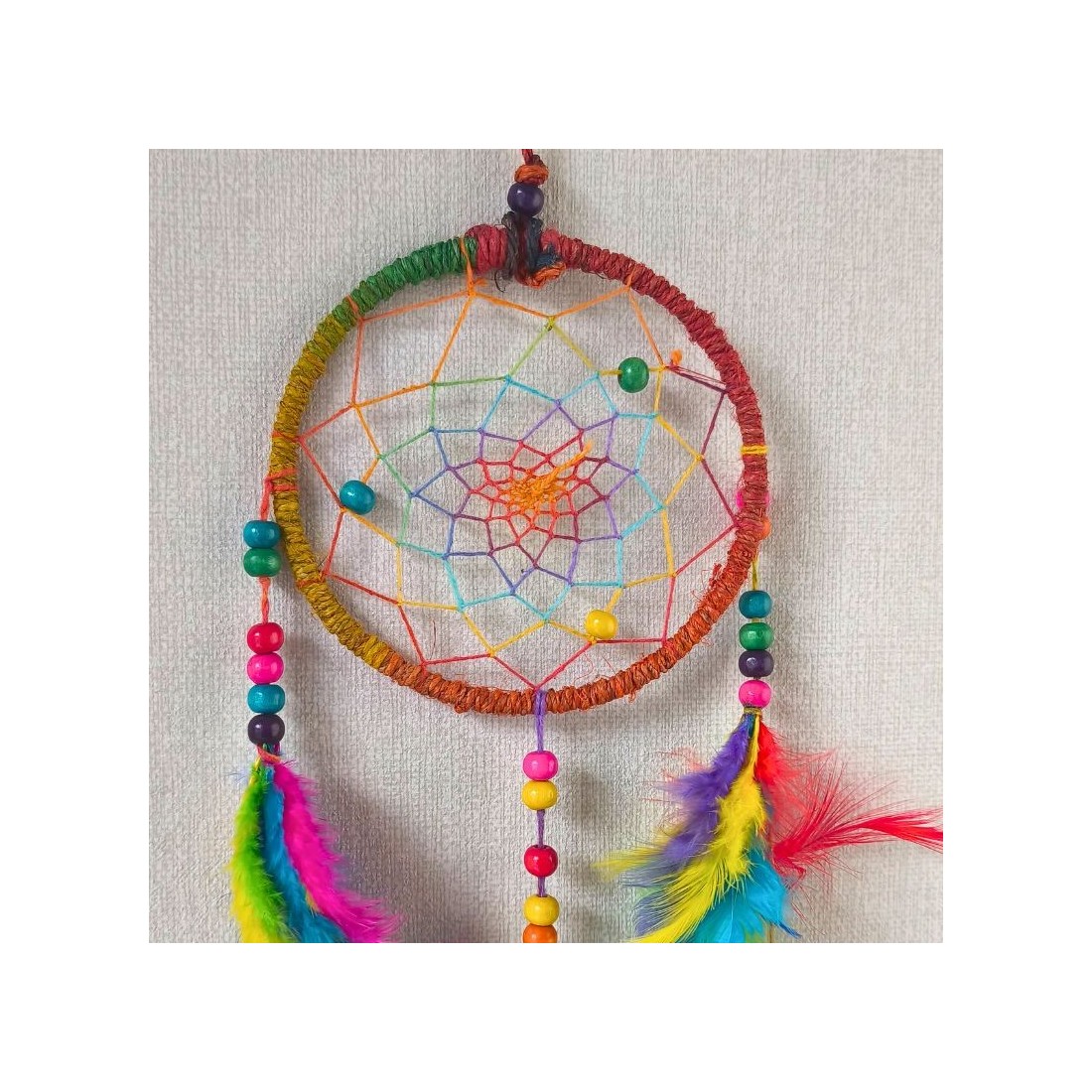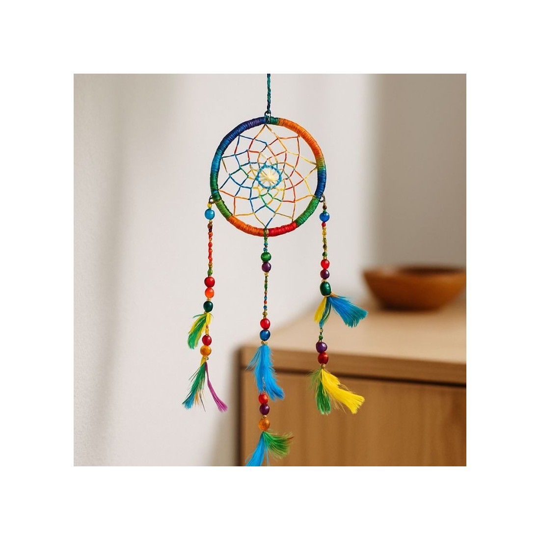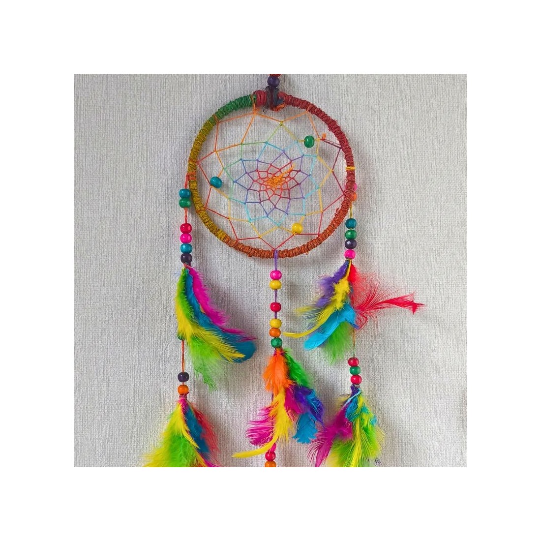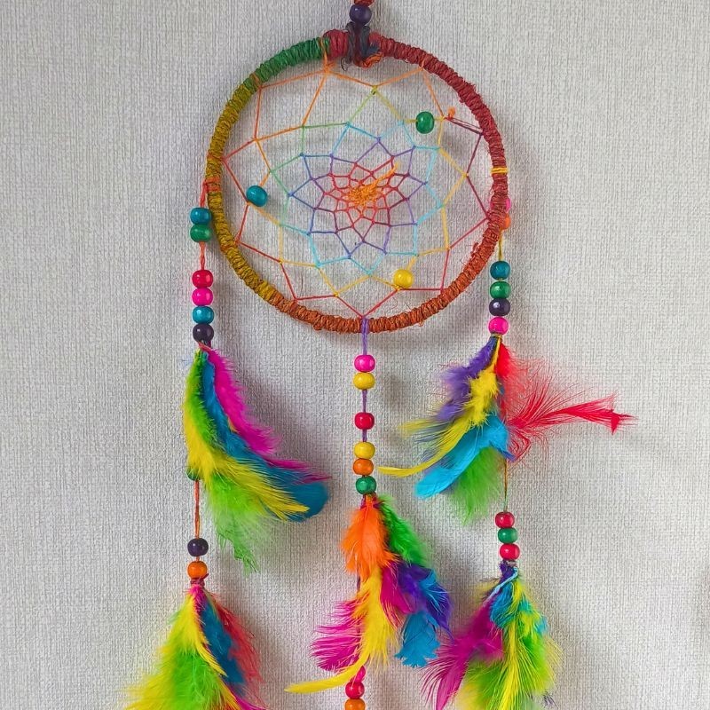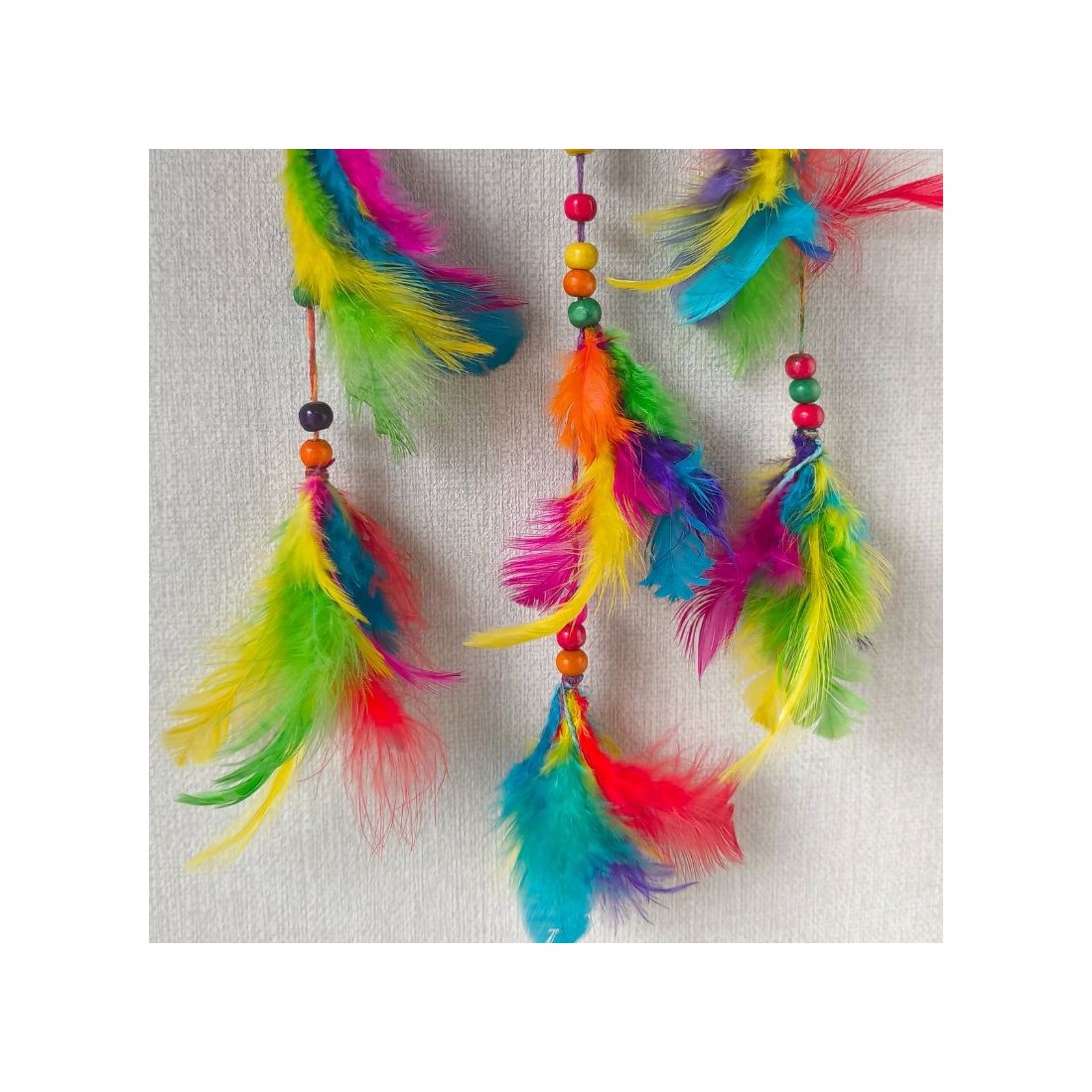 Tissé à la main en chanvre naturel, orné de perles colorées et de plumes légères, il apporte douceur, poésie et un éclat de couleurs dans une chambre ou un espace de calme.