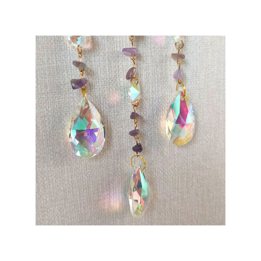 Accroché près d’une fenêtre, cet attrape-soleil diffuse une pluie d’éclats violets, dorés et irisés qui embellissent l’espace. Sa présence est à la fois douce, chaleureuse et hypnotique : un rayon de poésie pour un salon, une chambre, un bureau ou un coin méditation.