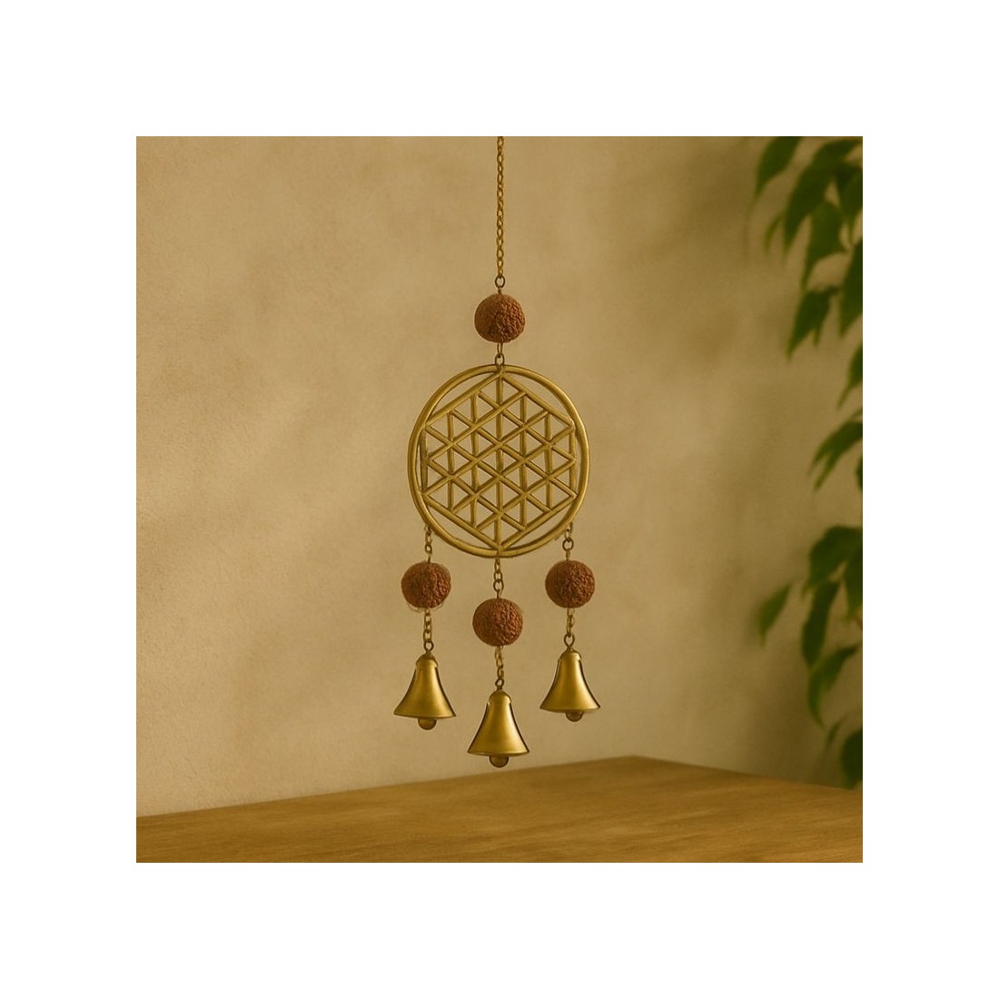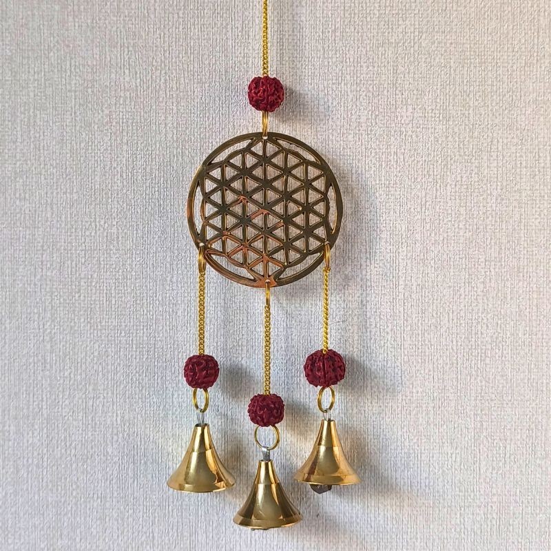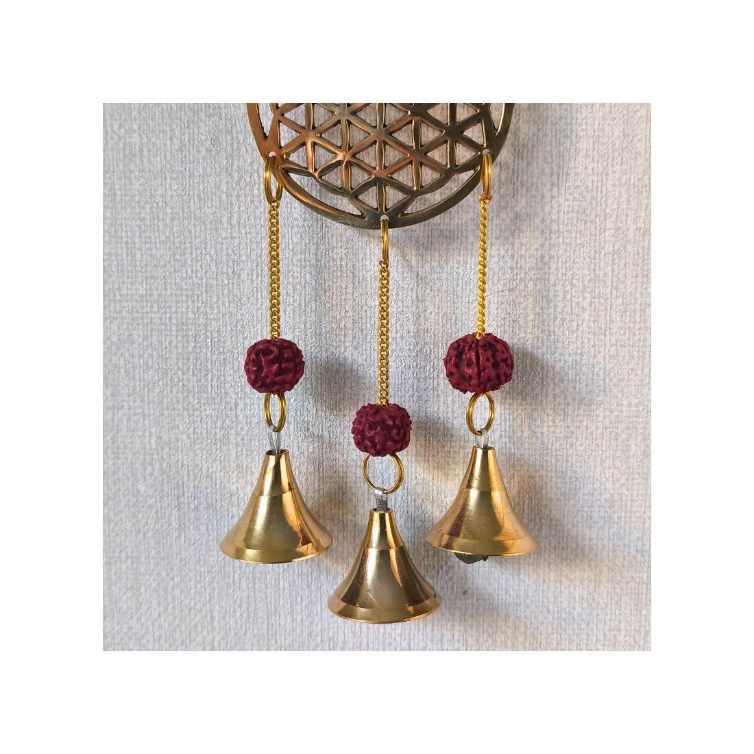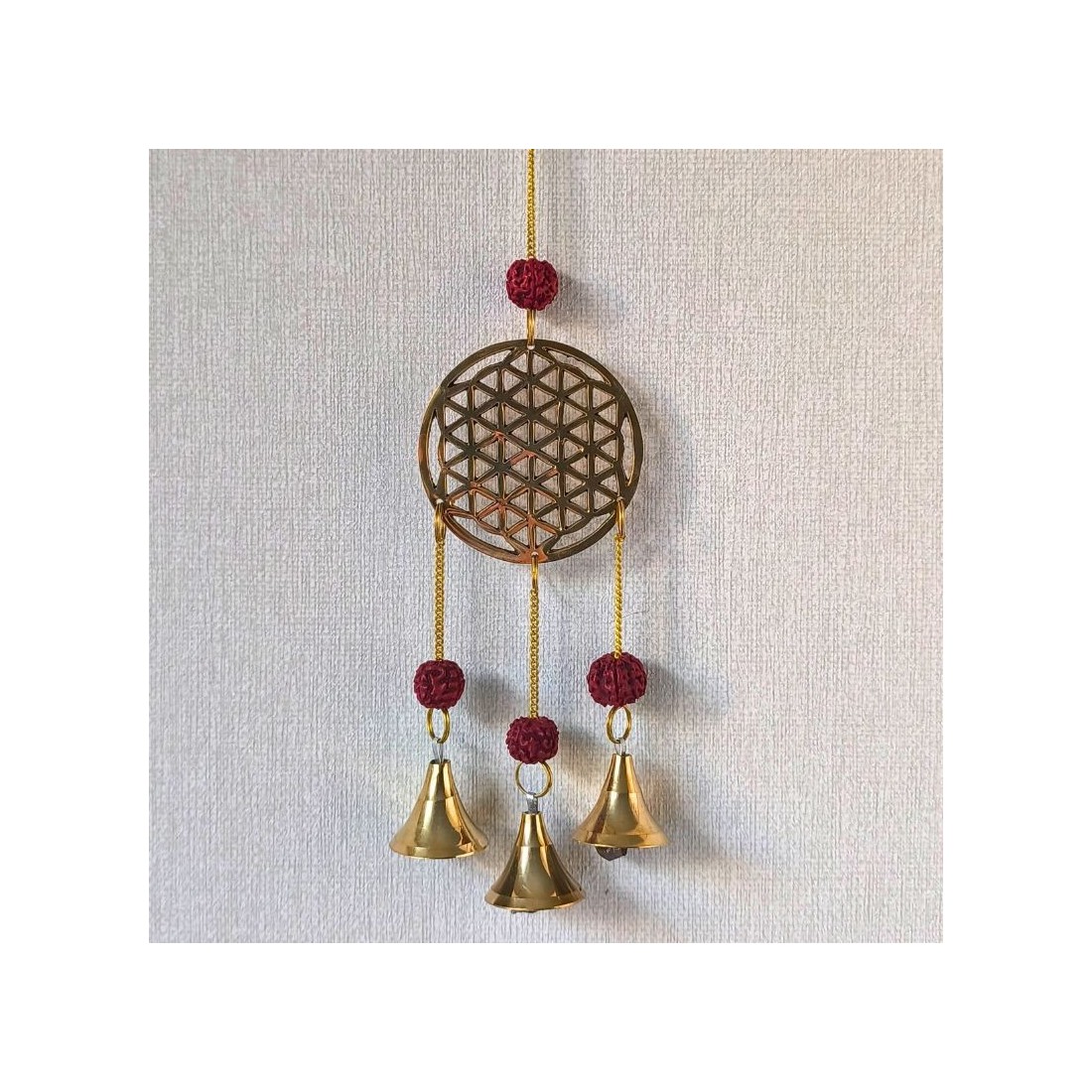 Ce carillon à vent artisanal associe une Fleur de Vie en métal, des perles de Rudraksha naturelles et trois petites cloches délicatement façonnées en Inde.