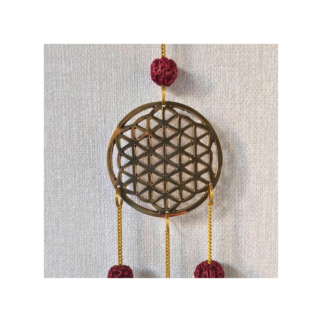 Carillon Fleur de Vie en méta recyclé avec perles de Rudraksha, fabriqué de façon artisanal en Inde.