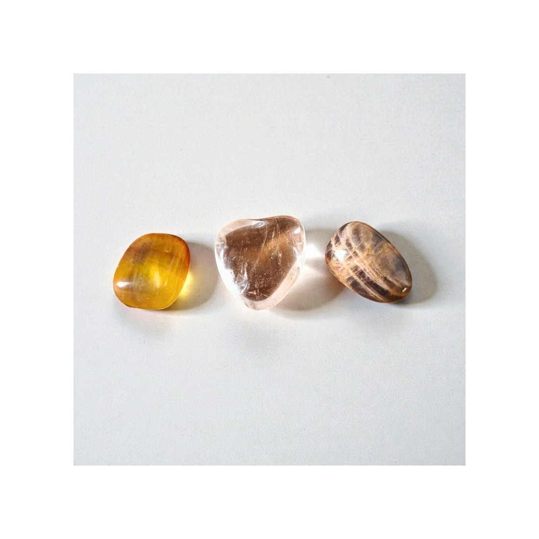 Ensemble, ces trois pierres roulées forment un trio équilibré et lumineux, idéal pour les enfants, les adolescents ou les adultes souhaitant retrouver lucidité, calme intérieur et intuition posée dans le quotidien.