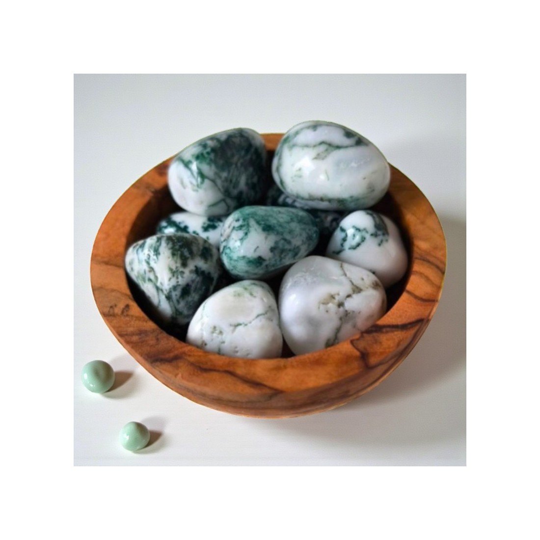 L’agate arbre est une pierre naturelle reconnaissable à ses inclusions vertes évoquant des ramures végétales, comme de petites branches figées dans la pierre.